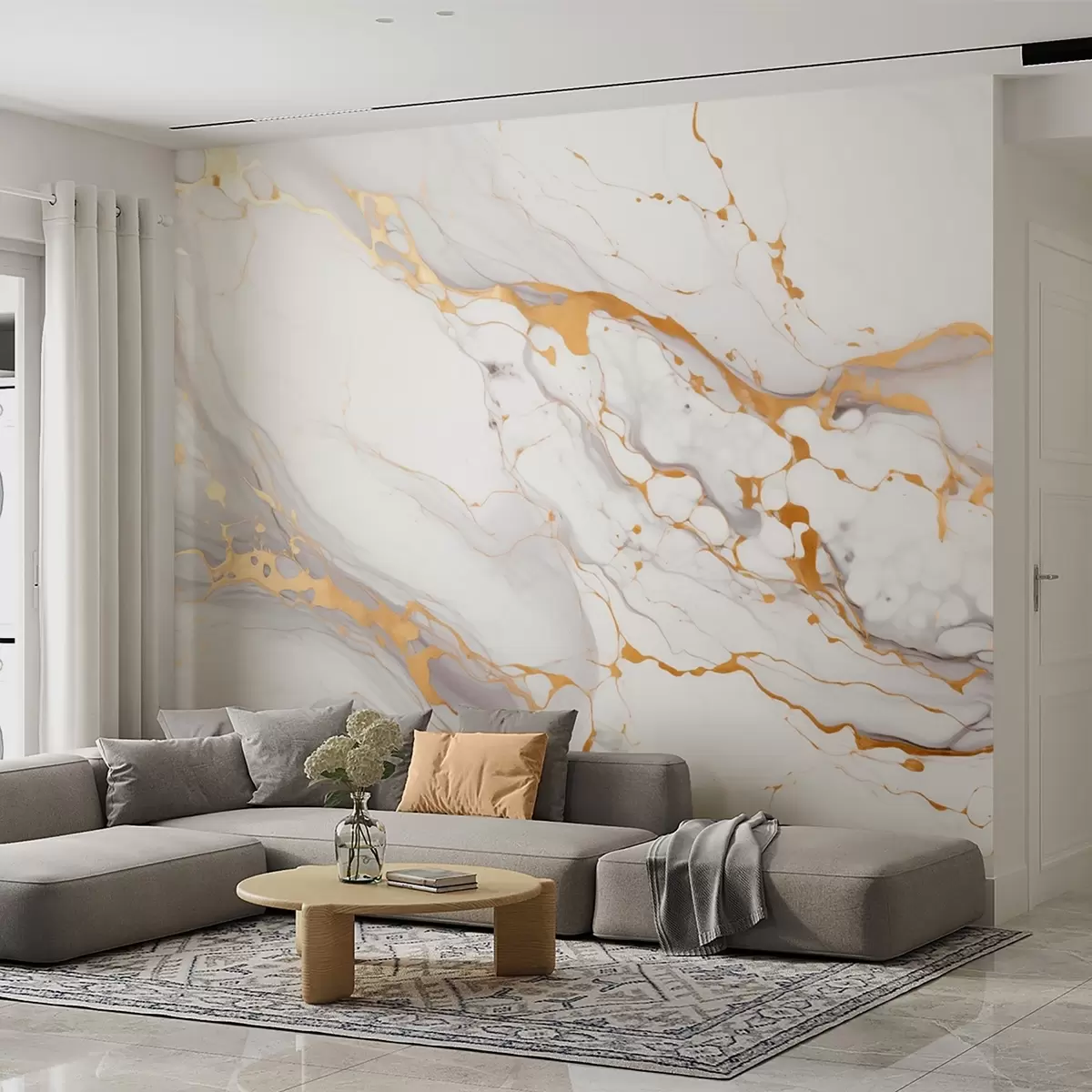 Тапете за зид Имитација мермерне текстуре са меким сивим прелазима и жутим акцентима бр. w09362