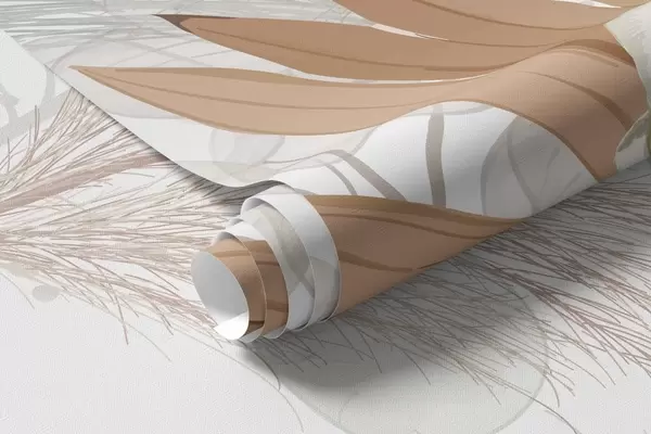 Тапете за зид Пампас трава, еукалиптус, тропско лишће и орхидеје на белој позадини, пастелне боје бр. w09366