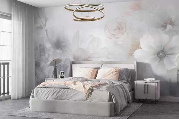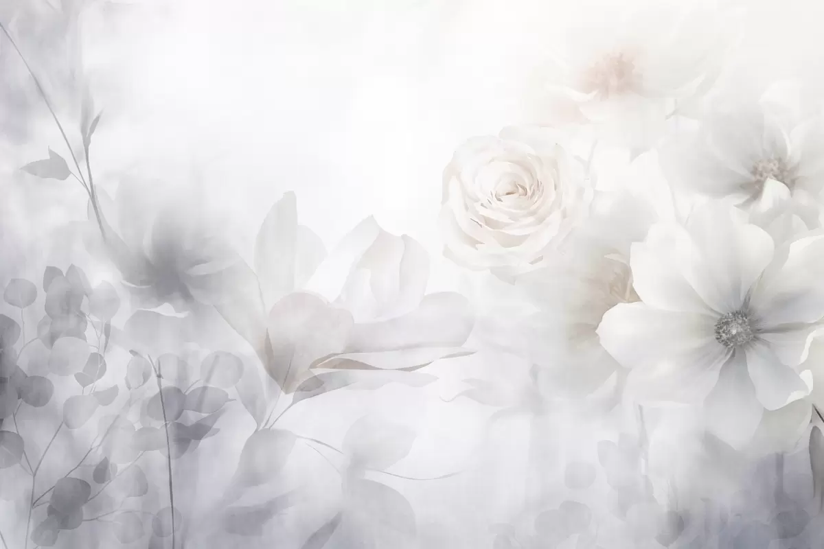 Тапете за зид Деликатан апстрактни цветни аранжман са пастелно ружичастим ружама и магнолијама, меки фокус, светло сива позадина бр. w09371