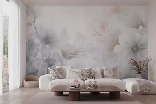 Тапете за зид Деликатан апстрактни цветни аранжман са пастелно ружичастим ружама и магнолијама, меки фокус, светло сива позадина бр. w09371