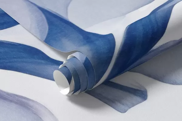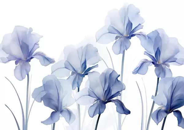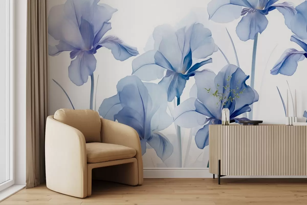 Тапете за зид Плави цветови ириса са провидним латицама и дугим стабљикама, распоређени у низу на плавој позадини, меки и текстурирани бр. w09379
