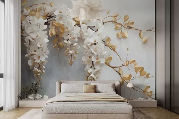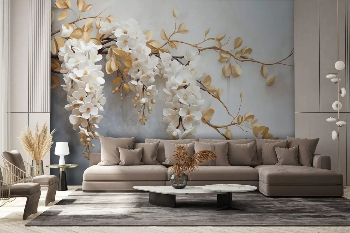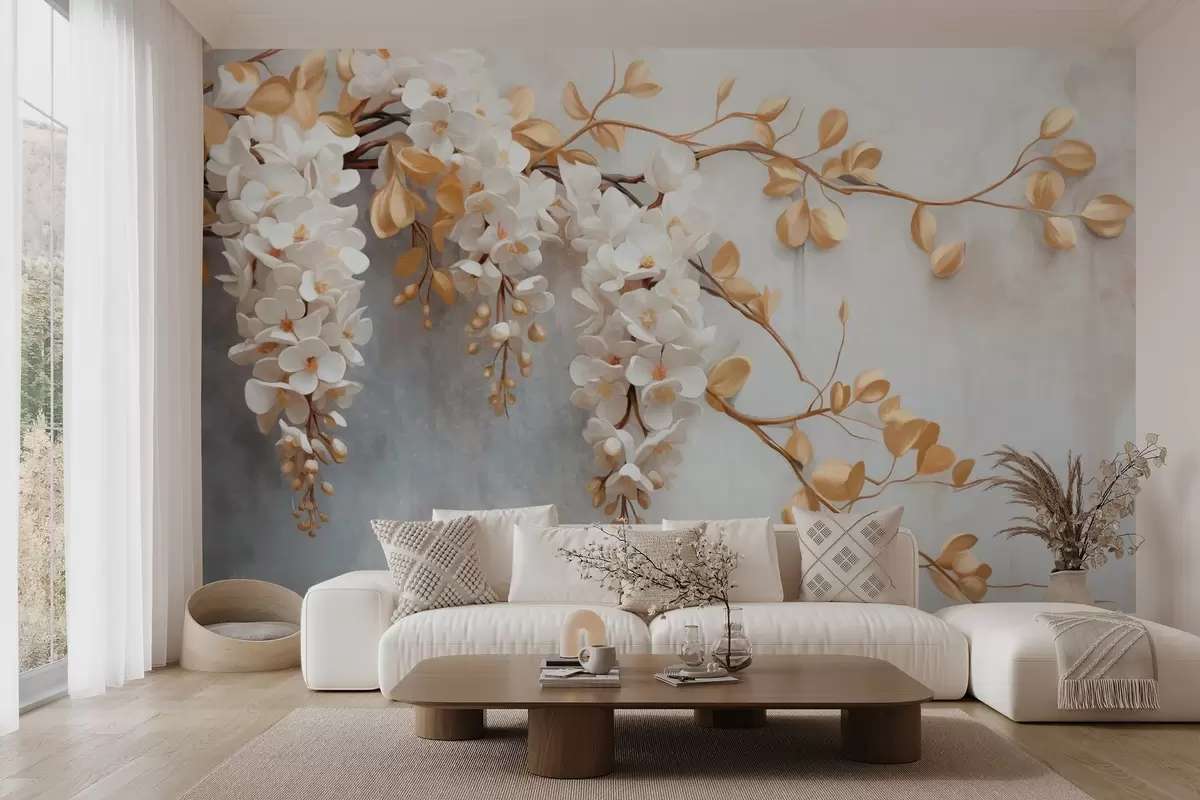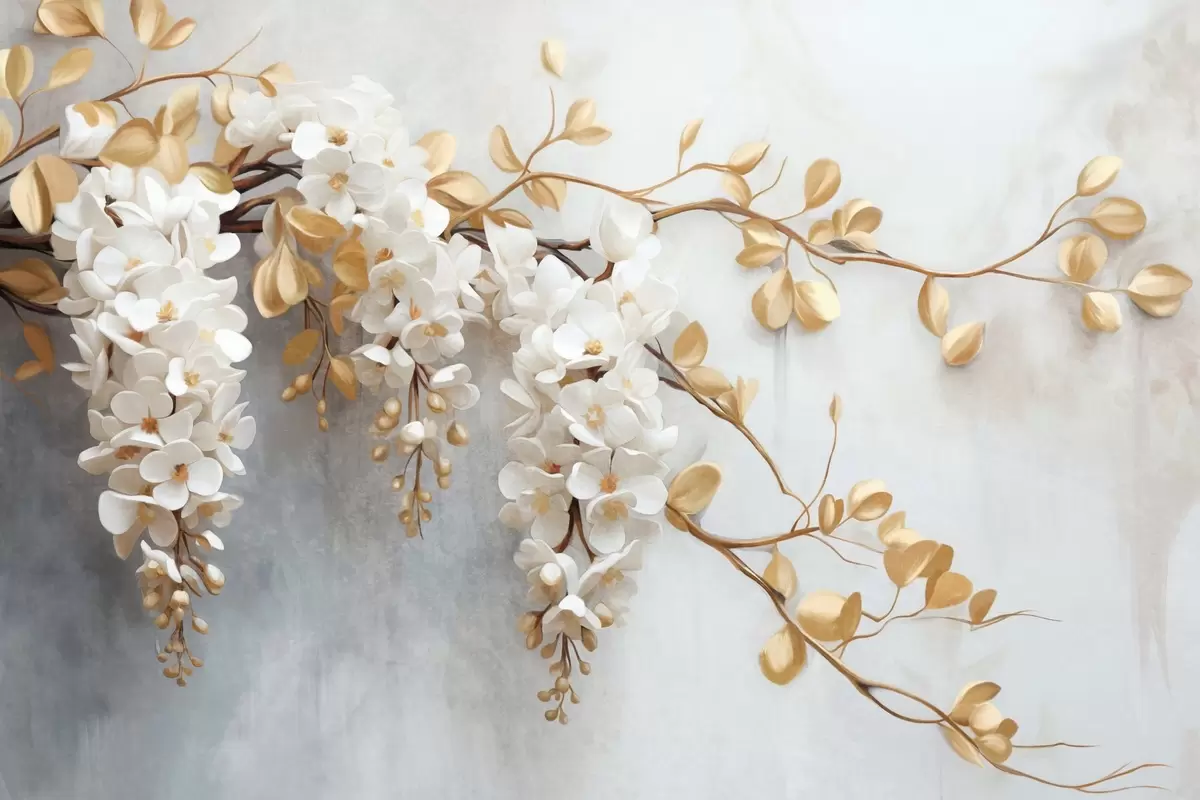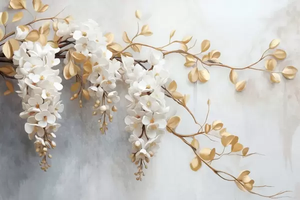 Тапете за зид Бели цветови глициније са жутим листовима на грани, који се спуштају низ текстурирану белу позадину, нежне латице бр. w09381
