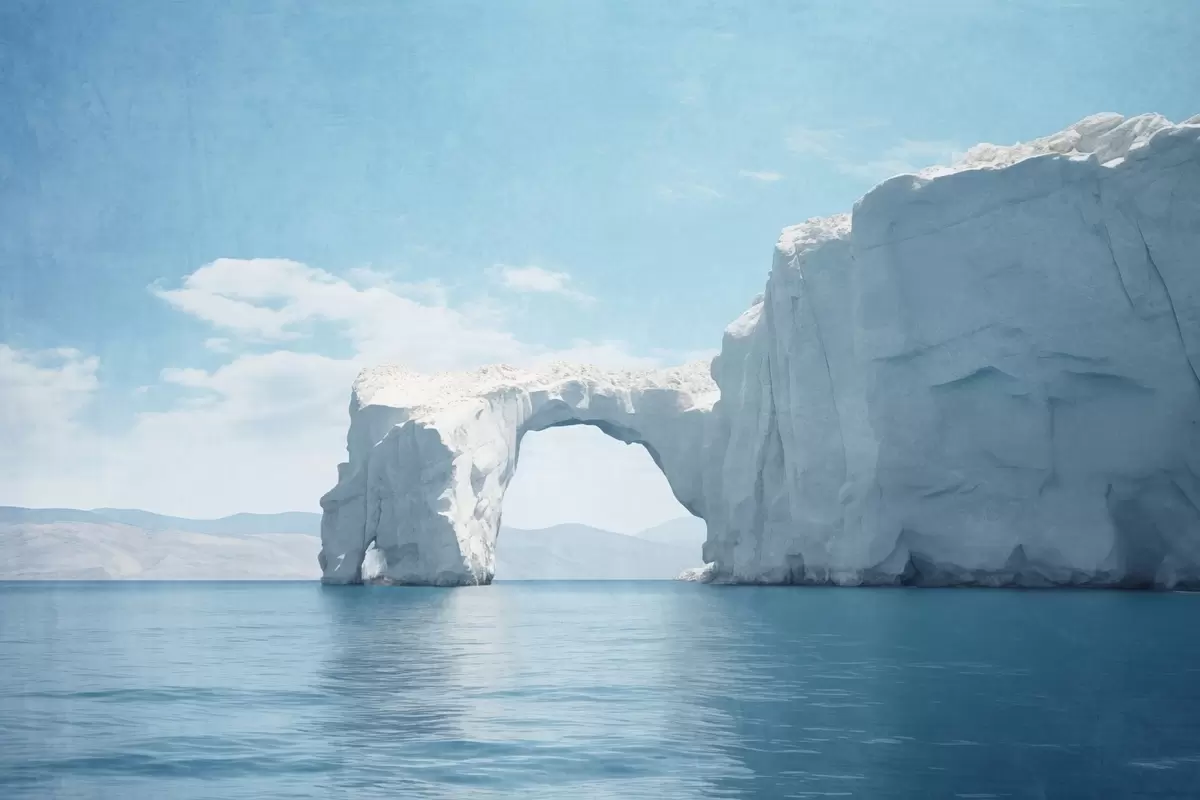 Тапете за зид Пејзаж са природним леденим мостом преко океана, ведро плаво небо са облацима, текстурирани отисак бр. w09383