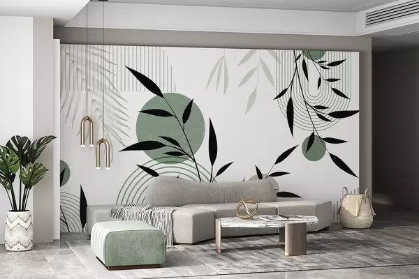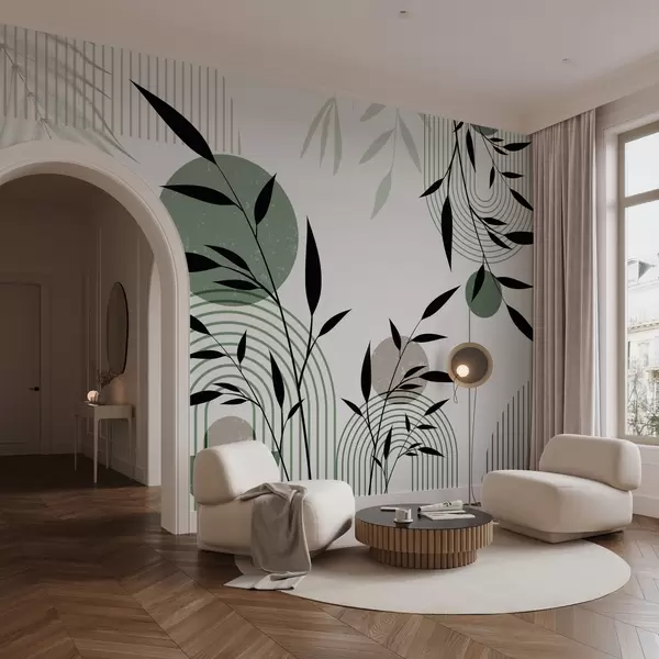 wall murals Текстурирани апстрактни отисак са геометријским облицима, круговима и луковима и црно-зеленим биљкама на белој позадини w09384