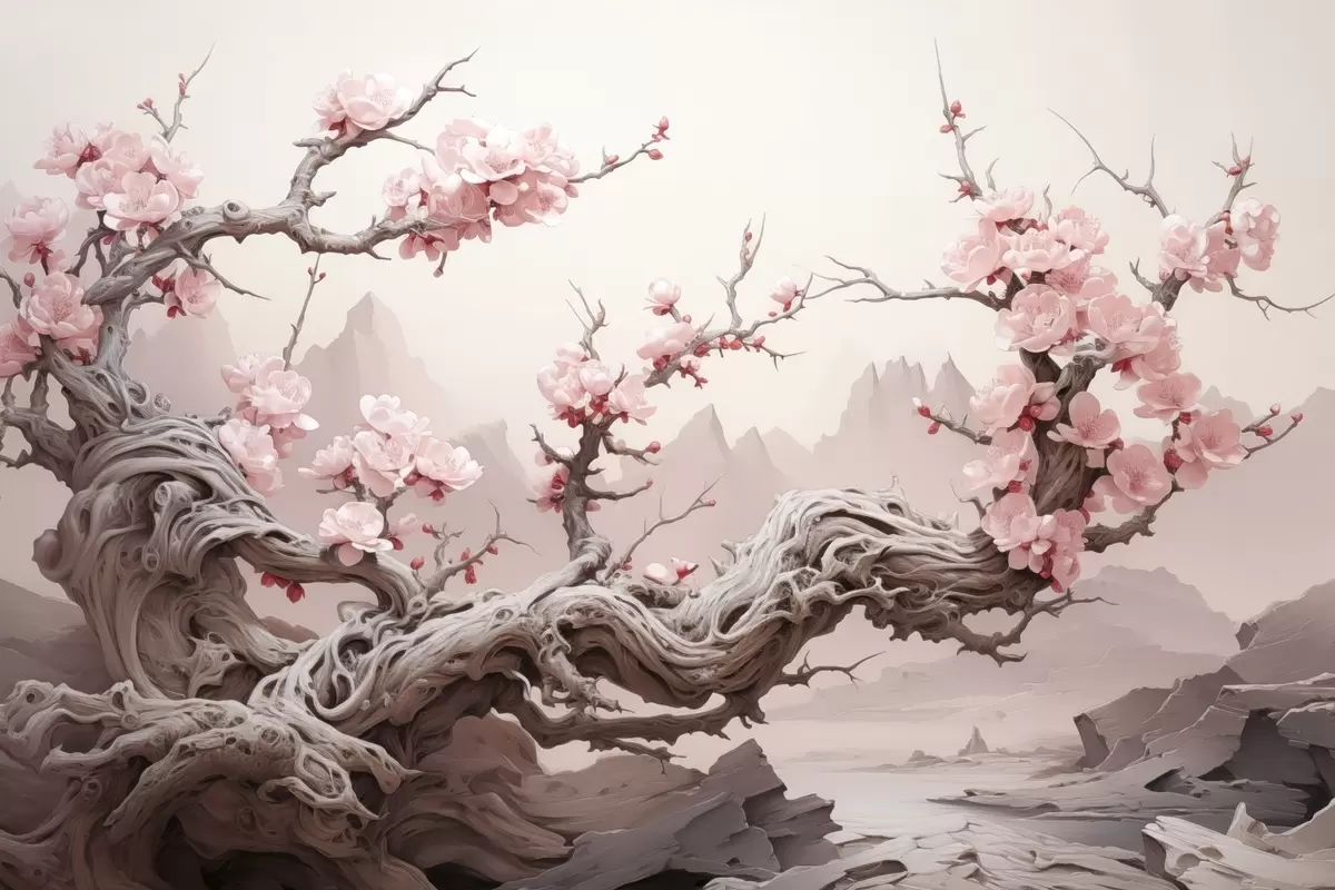 Тапете за зид Увијено дебло дрвета са цветајућом ружичастом сакуром бр. w09388