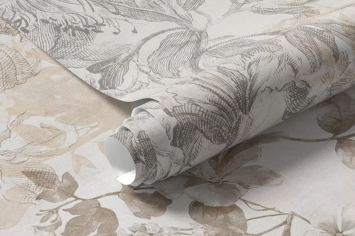 Тапете за зид Винтаге текстурирана цветна уметност са илустрацијама нежног баштенског цвећа и лишћа у стилу цртања, меки пастелни беж и сепија тонови бр. w09402