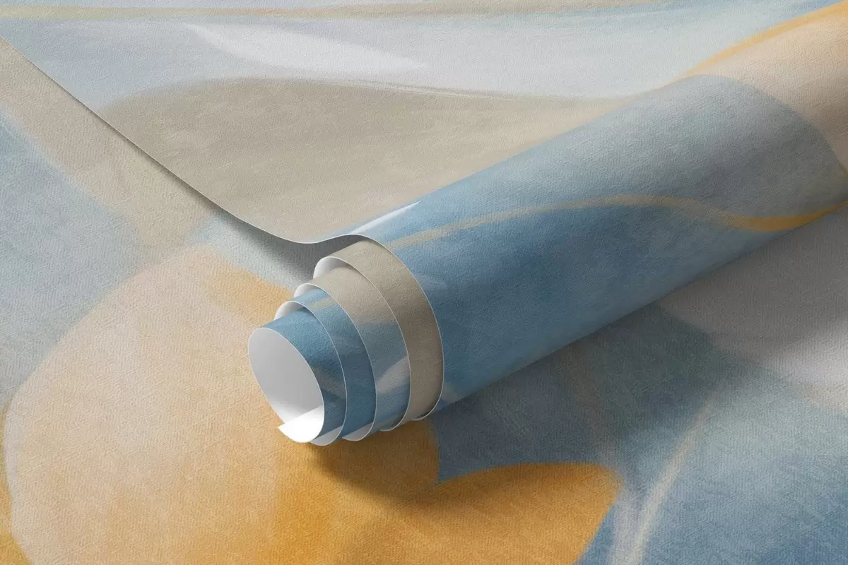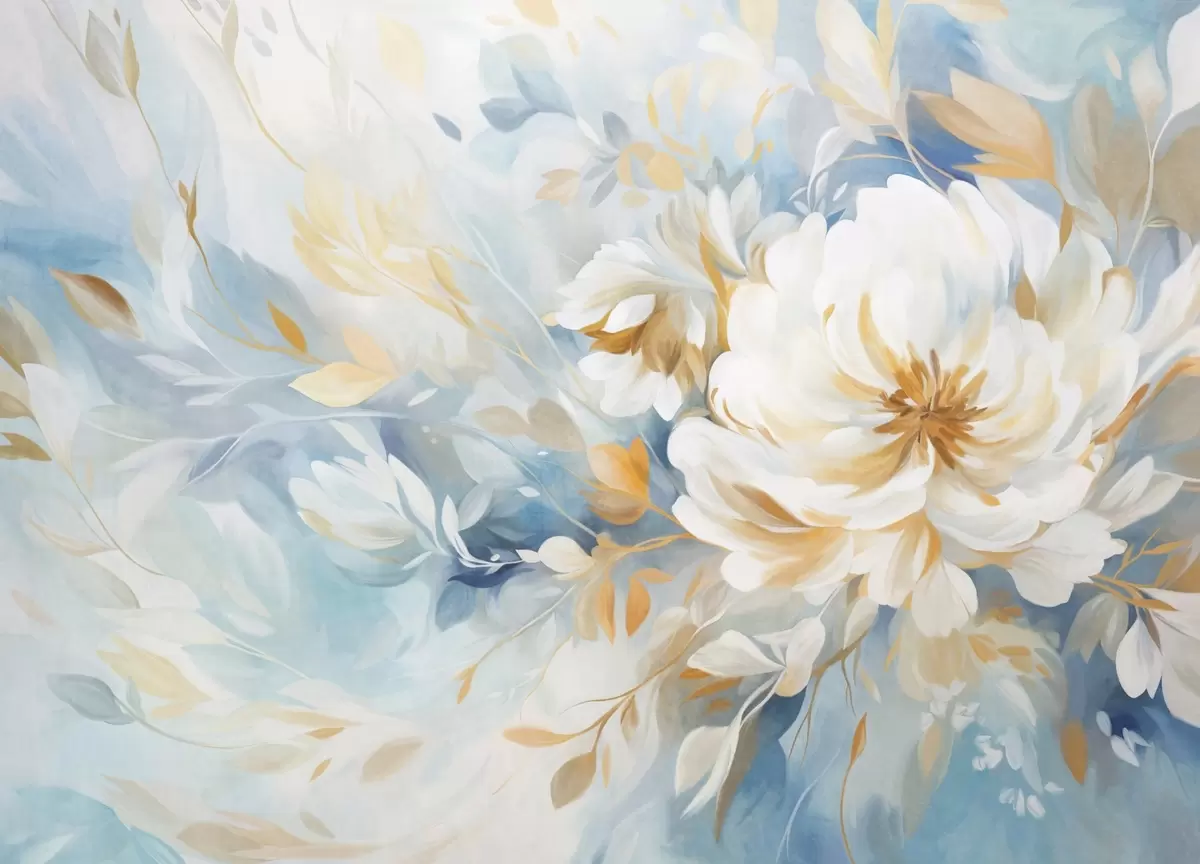 Тапете за зид Текстурирани бели цвет са плавим и жутим детаљима и листовима на плавој и белој апстрактној позадини, стил сликања бр. w09403