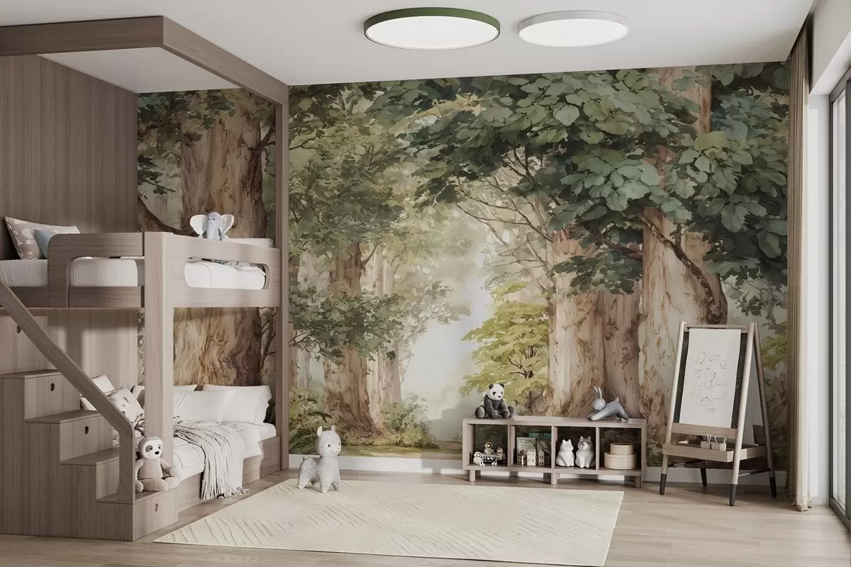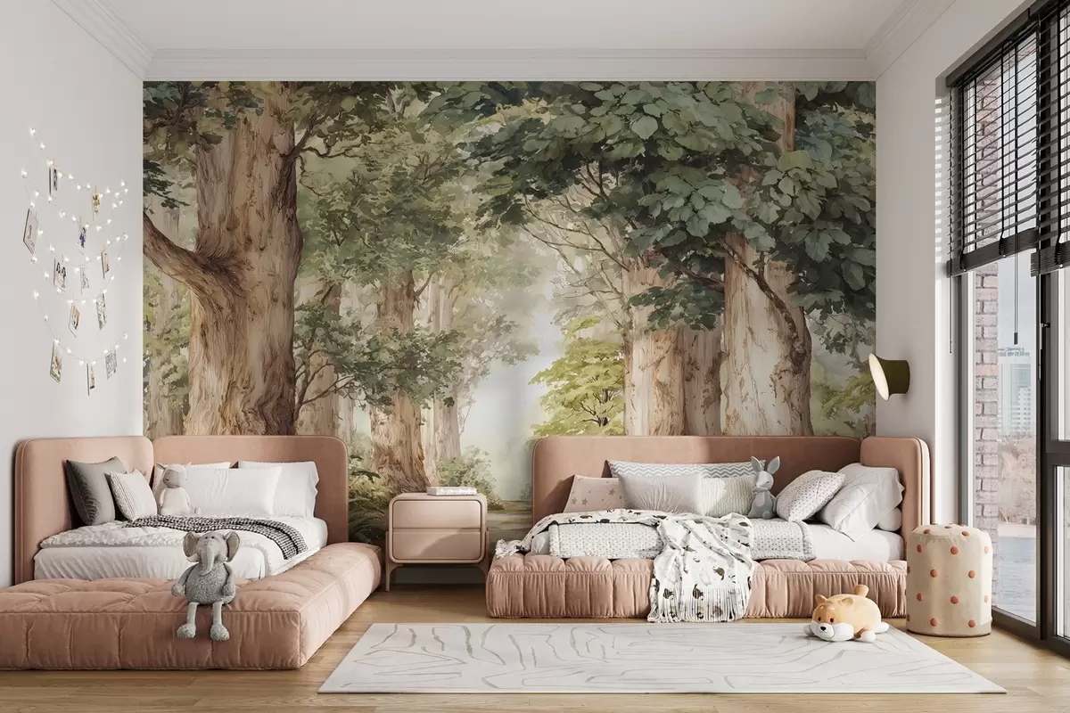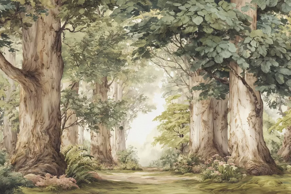 Тапете за зид Шумска стаза међу величанственим дрвећем у акварелном стилу бр. w09404