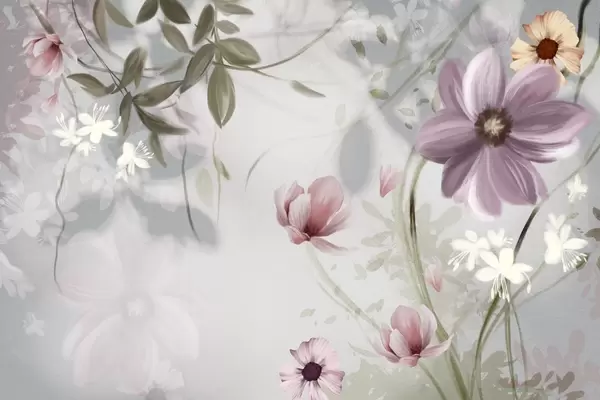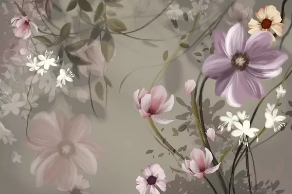 Тапете за зид Ружичасто и бело цвеће са смеђим стабљикама и листовима, меко осветљење, пригушене боје, цветни аранжман бр. w09417
