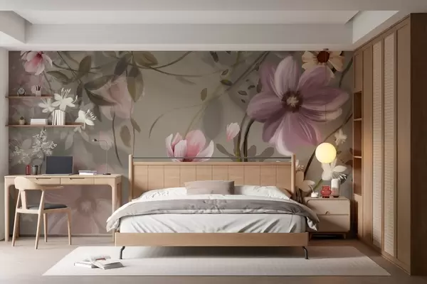 Тапете за зид Ружичасто и бело цвеће са смеђим стабљикама и листовима, меко осветљење, пригушене боје, цветни аранжман бр. w09417
