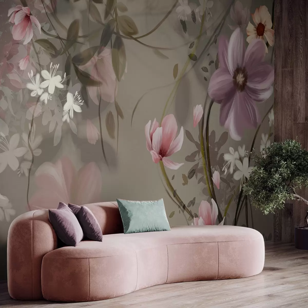 Тапете за зид Ружичасто и бело цвеће са смеђим стабљикама и листовима, меко осветљење, пригушене боје, цветни аранжман бр. w09417