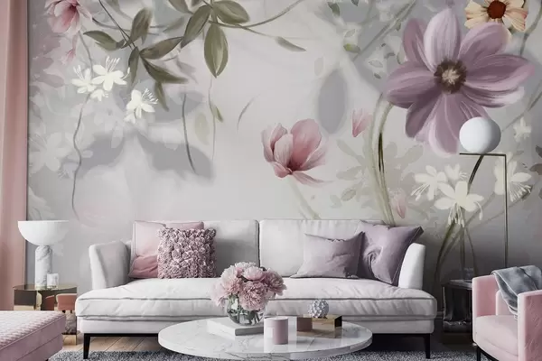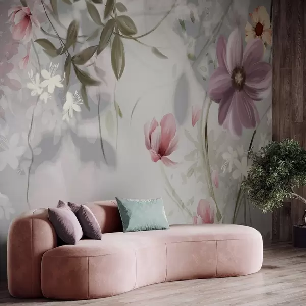Тапете за зид Ружичасто и бело цвеће са зеленим стабљикама и листовима, меко осветљење, пригушене боје, цветни аранжман бр. w09417v1