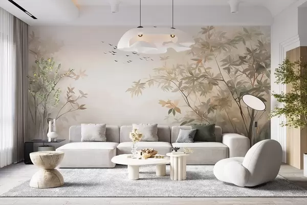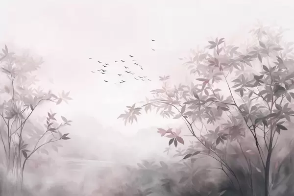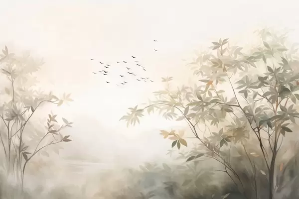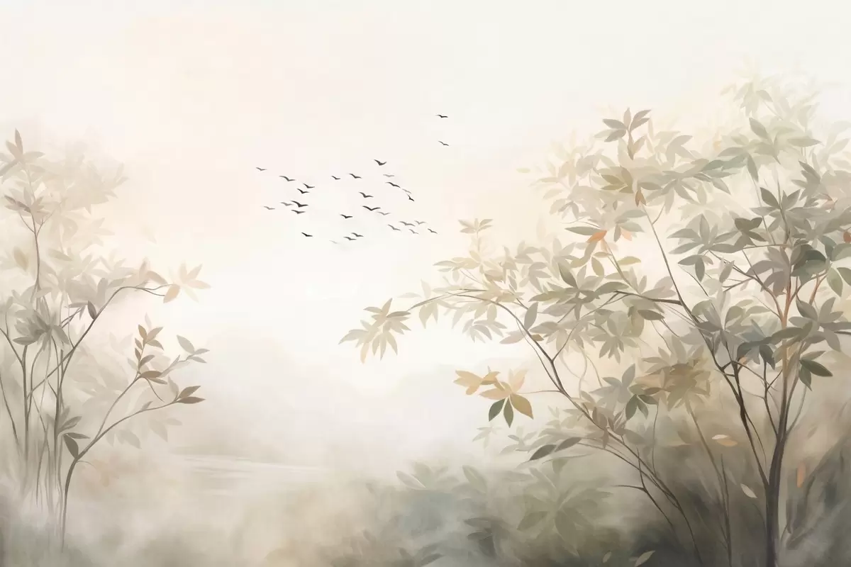 Тапете за зид Текстурирани пејзаж са дрвећем и јатом птица које лете небом, пастелне боје, природа бр. w09418