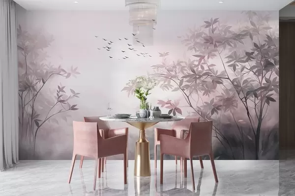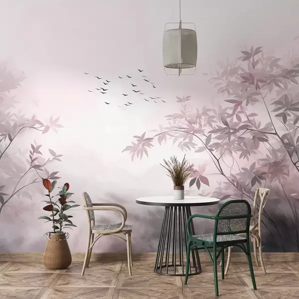 Тапете за зид Текстурирани пејзаж са дрвећем и јатом птица које лете небом, пастелне боје, природа бр. w09418v1