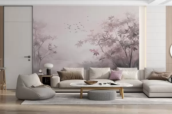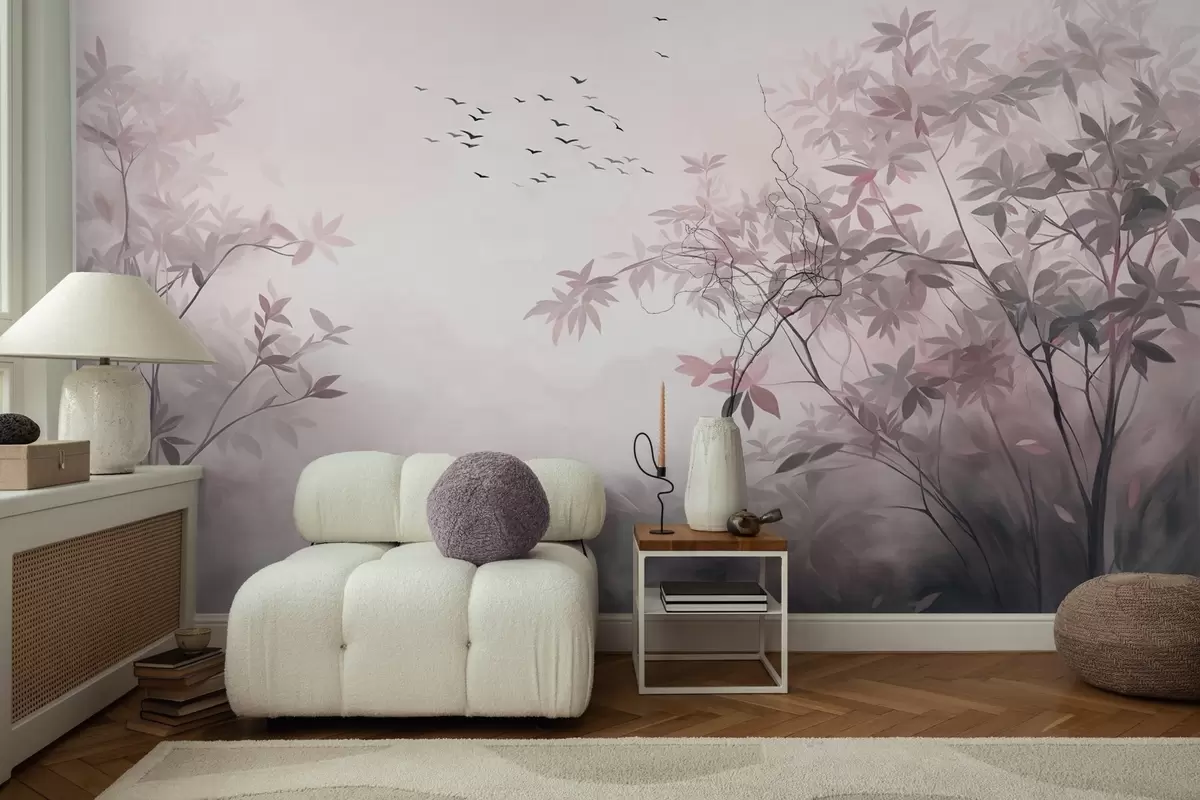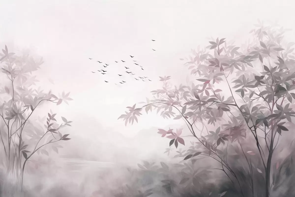 Тапете за зид Текстурирани пејзаж са дрвећем и јатом птица које лете небом, пастелне боје, природа бр. w09418v1