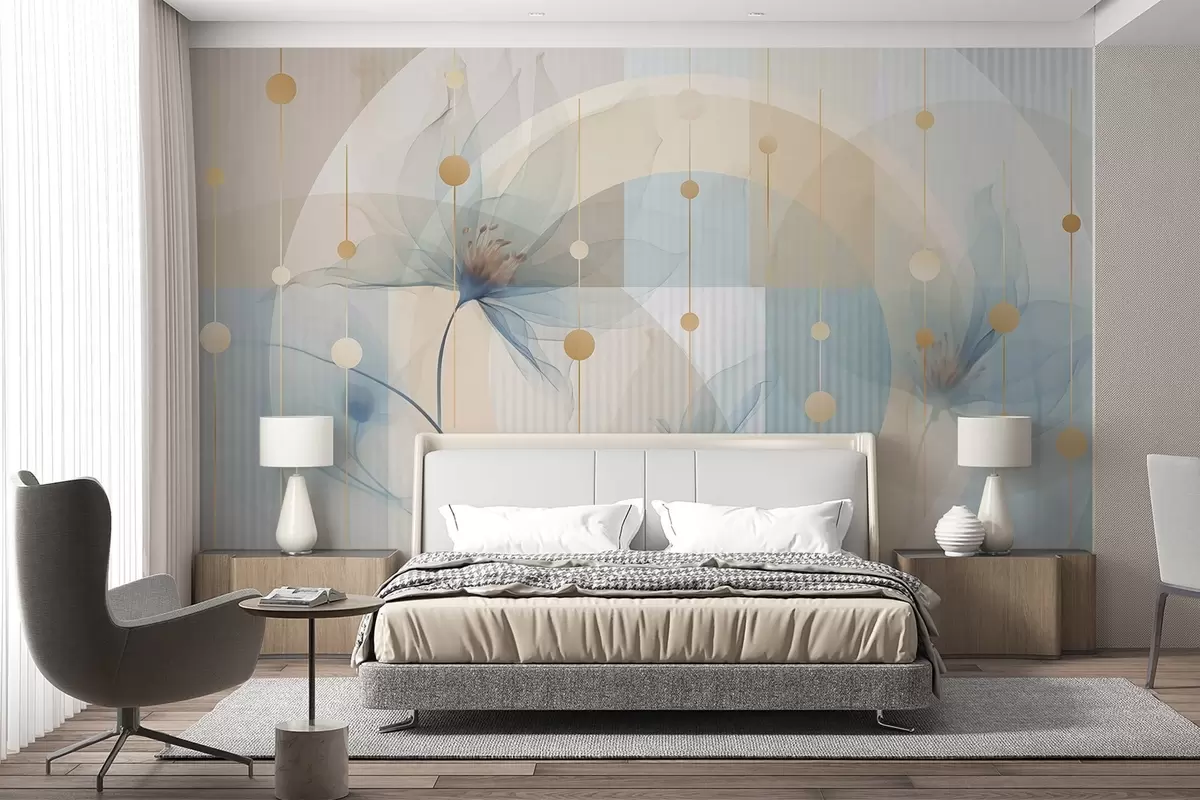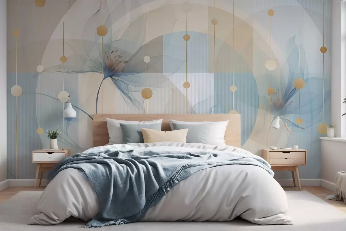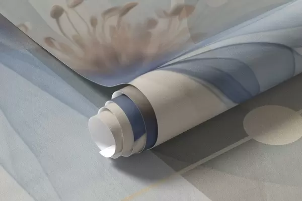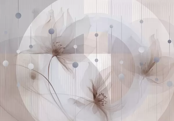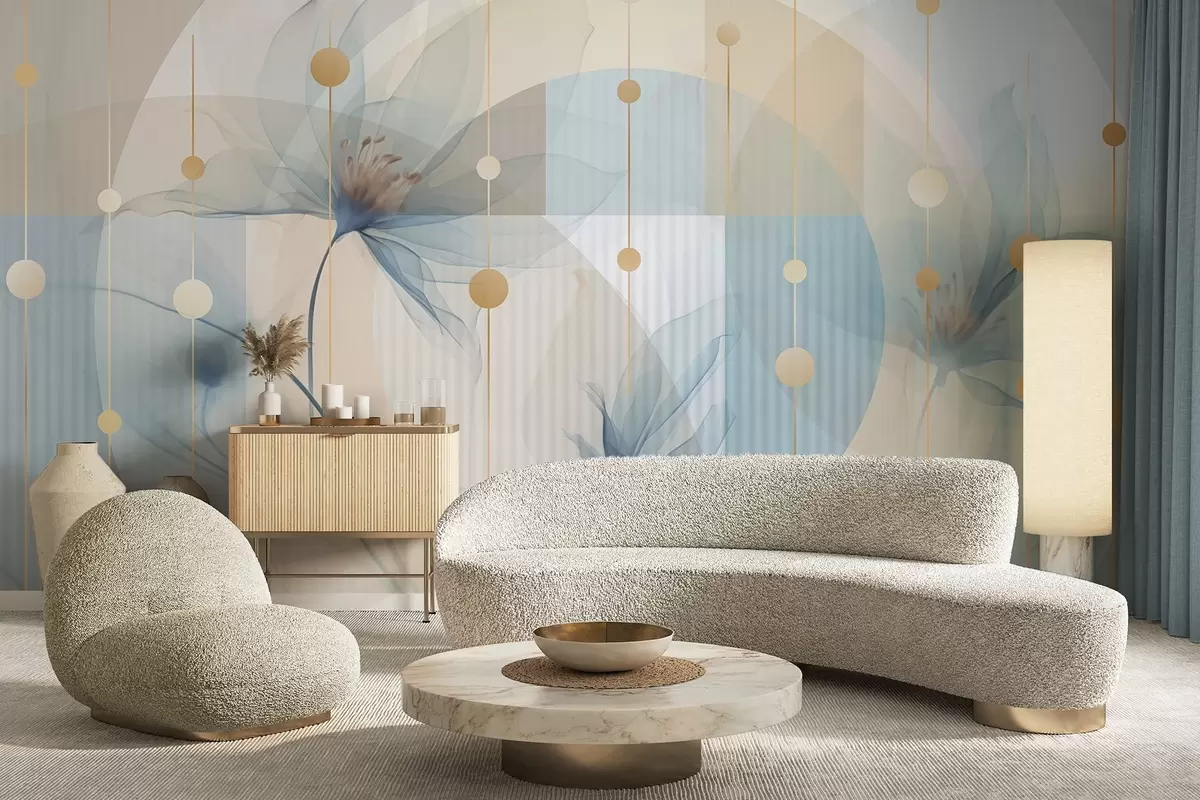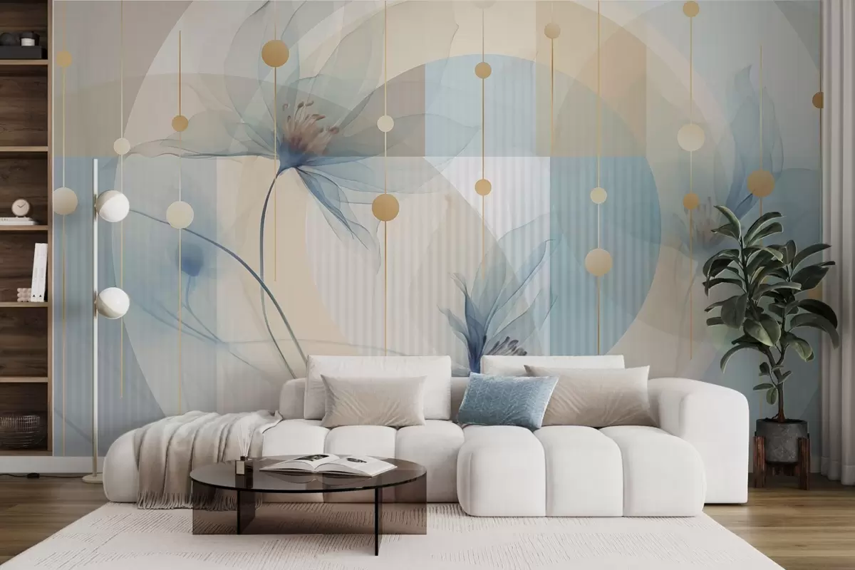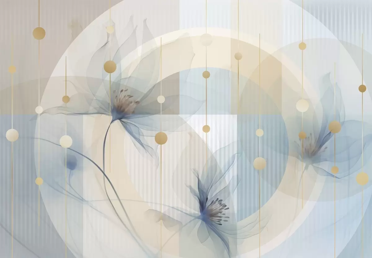 Тапете за зид Апстрактни провидни цветови, кругови и геометријски облици, пастелно плава, беж и бела палета боја бр. w09419