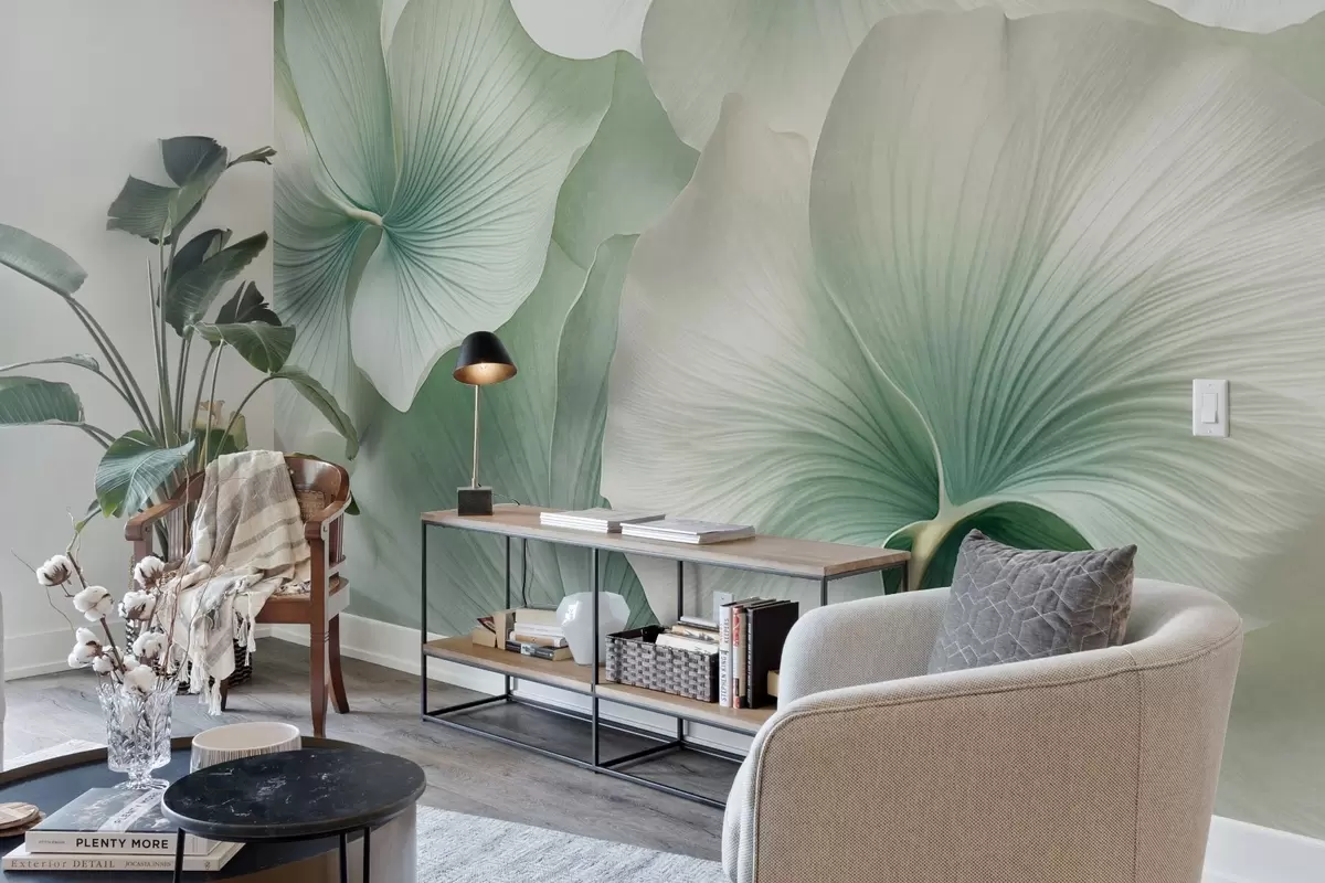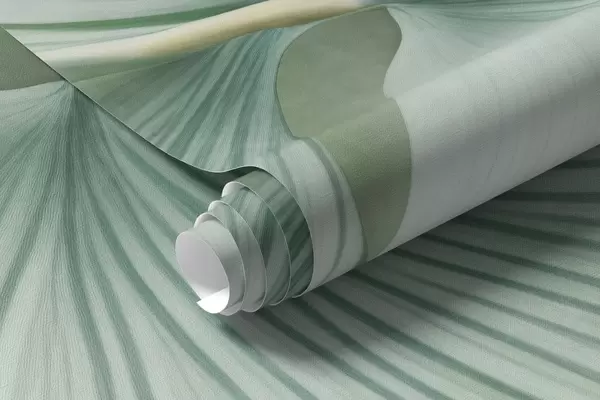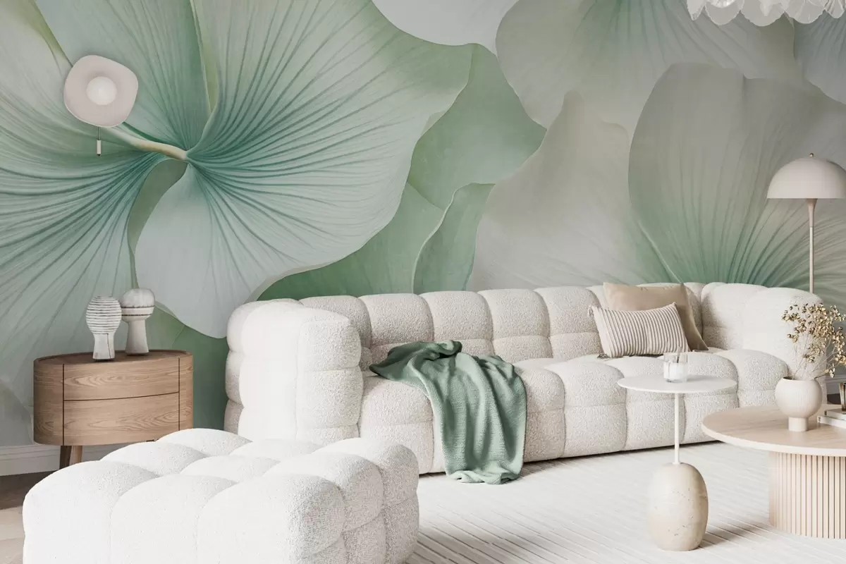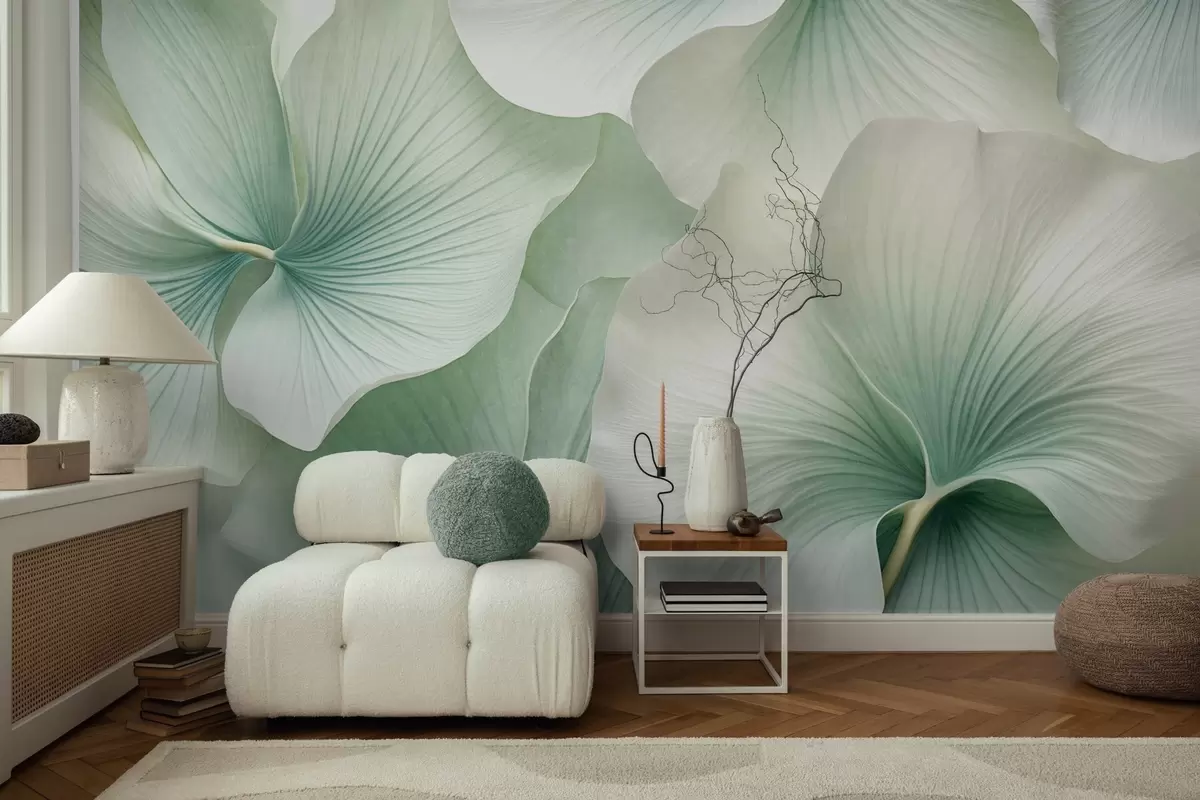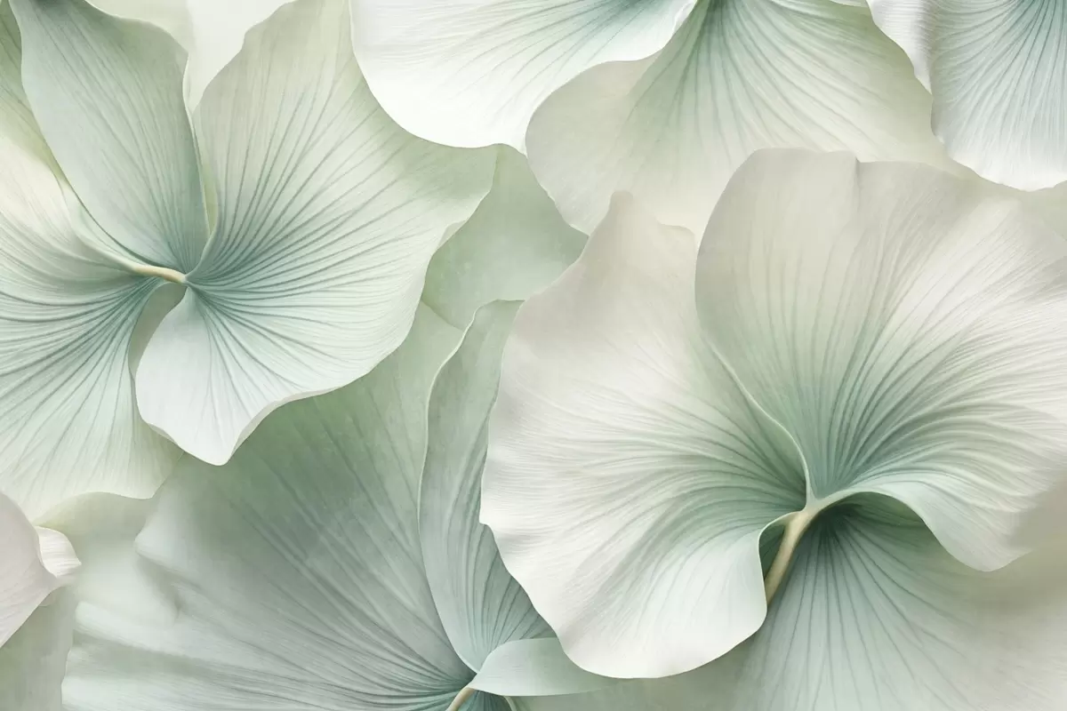 Тапете за зид Бели и зелени листови гинка, мека текстура, апстрактна цветна позадина, минималистички модерни стил бр. w09421