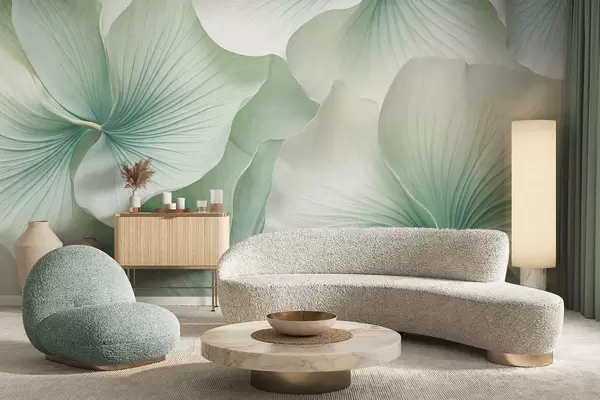 Тапете за зид Бели и зелени листови гинка, мека текстура, апстрактна цветна позадина, минималистички модерни стил бр. w09421
