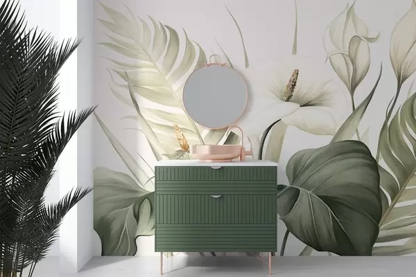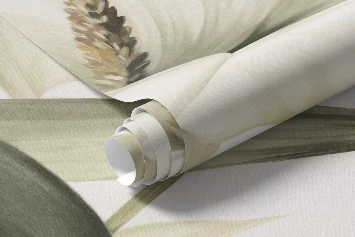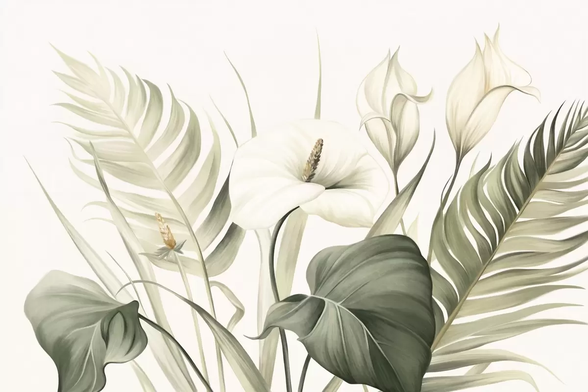 Тапете за зид Беле кале и зелено тропско лишће, ботаничка илустрација, светла позадина, винтаге стил, текстурирано бр. w09423