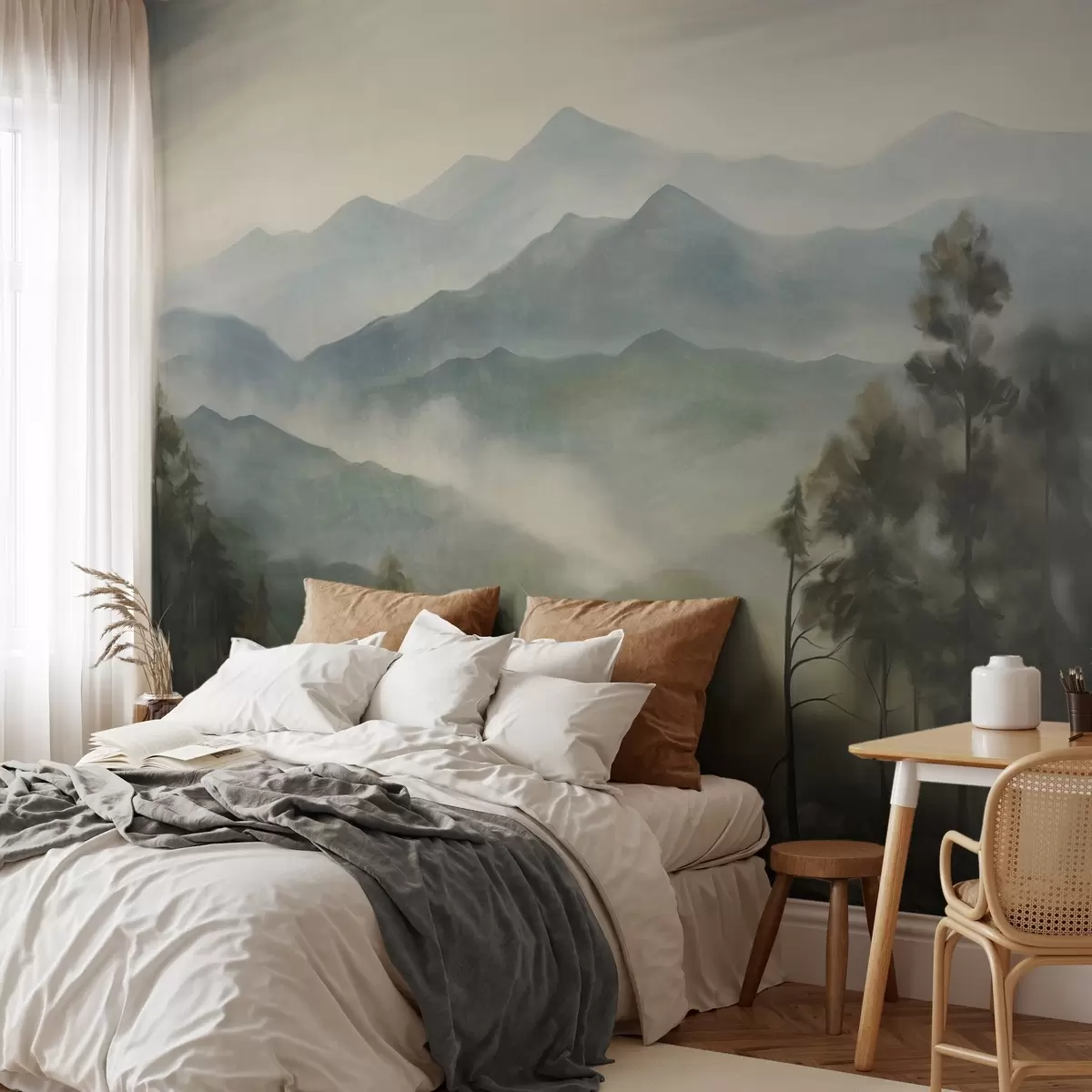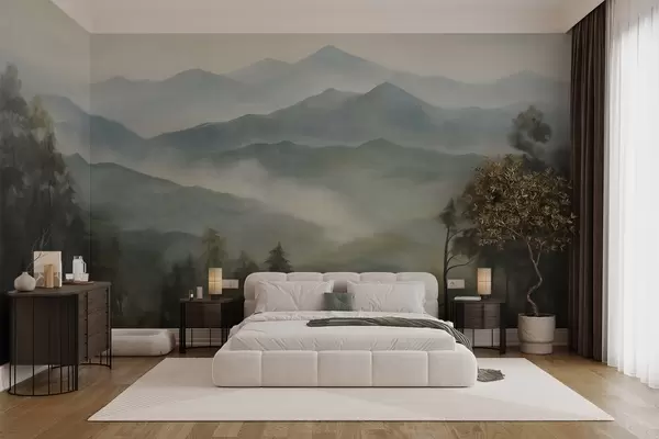 Тапете за зид Магловити планински ланац са дрвећем, маглом, облачним небом, пригушеним бојама, стилом пејзажног сликарства бр. w09424