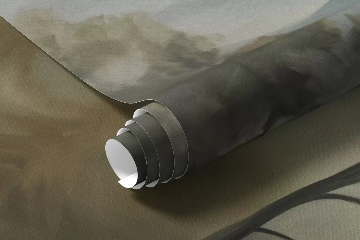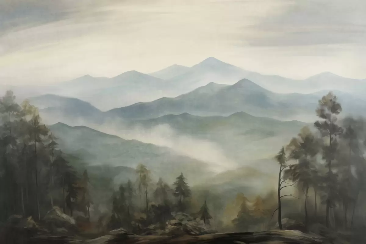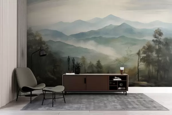 Тапете за зид Магловити планински ланац са дрвећем, маглом, облачним небом, пригушеним бојама, стилом пејзажног сликарства бр. w09424
