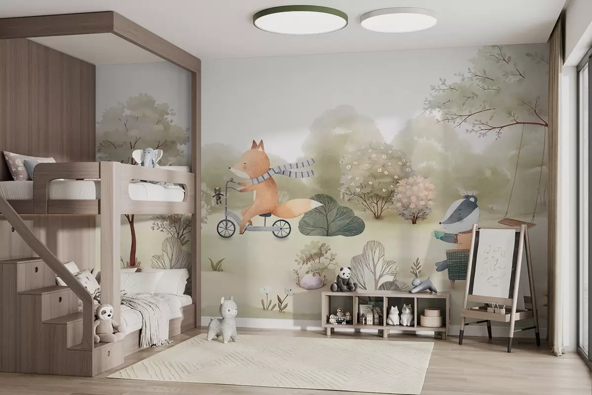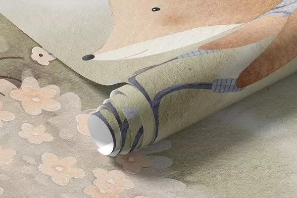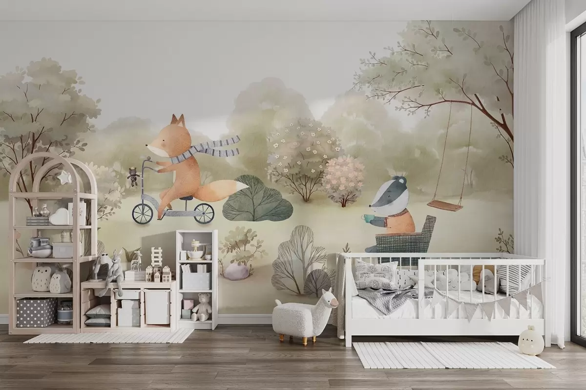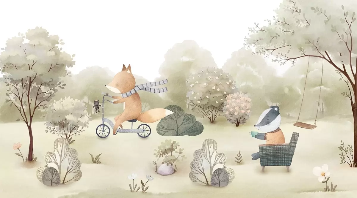 Тапете за зид Лисица на бициклу и јазавац са чајем, шумске животиње у акварел стилу бр. w09439