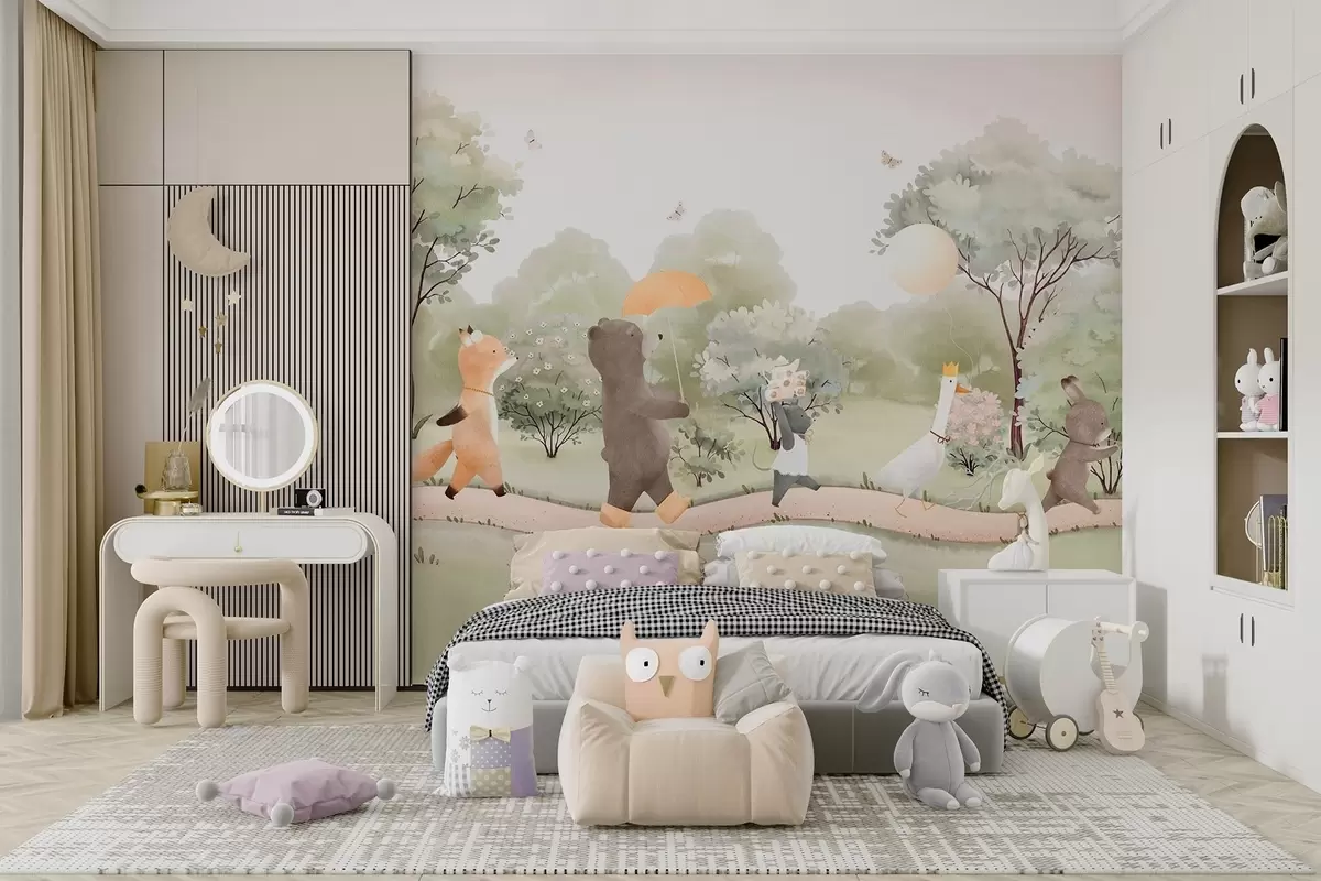Тапете за зид Свечано путовање малих животиња кроз шуму у стилу акварела бр. w09440