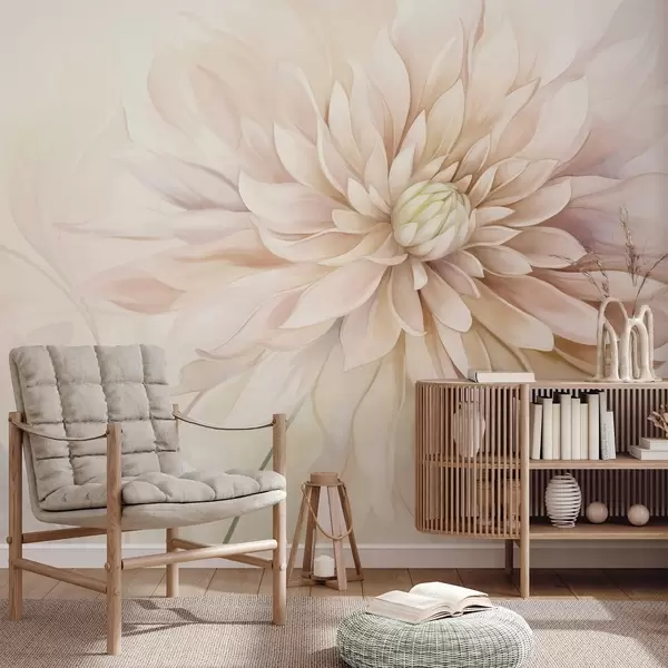 Тапете за зид Светло ружичасти цвет далије са много латица, мека текстурирана пастелна позадина са нотама зелене и беж боје бр. w09470