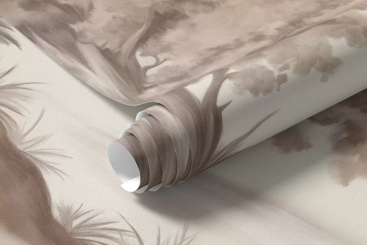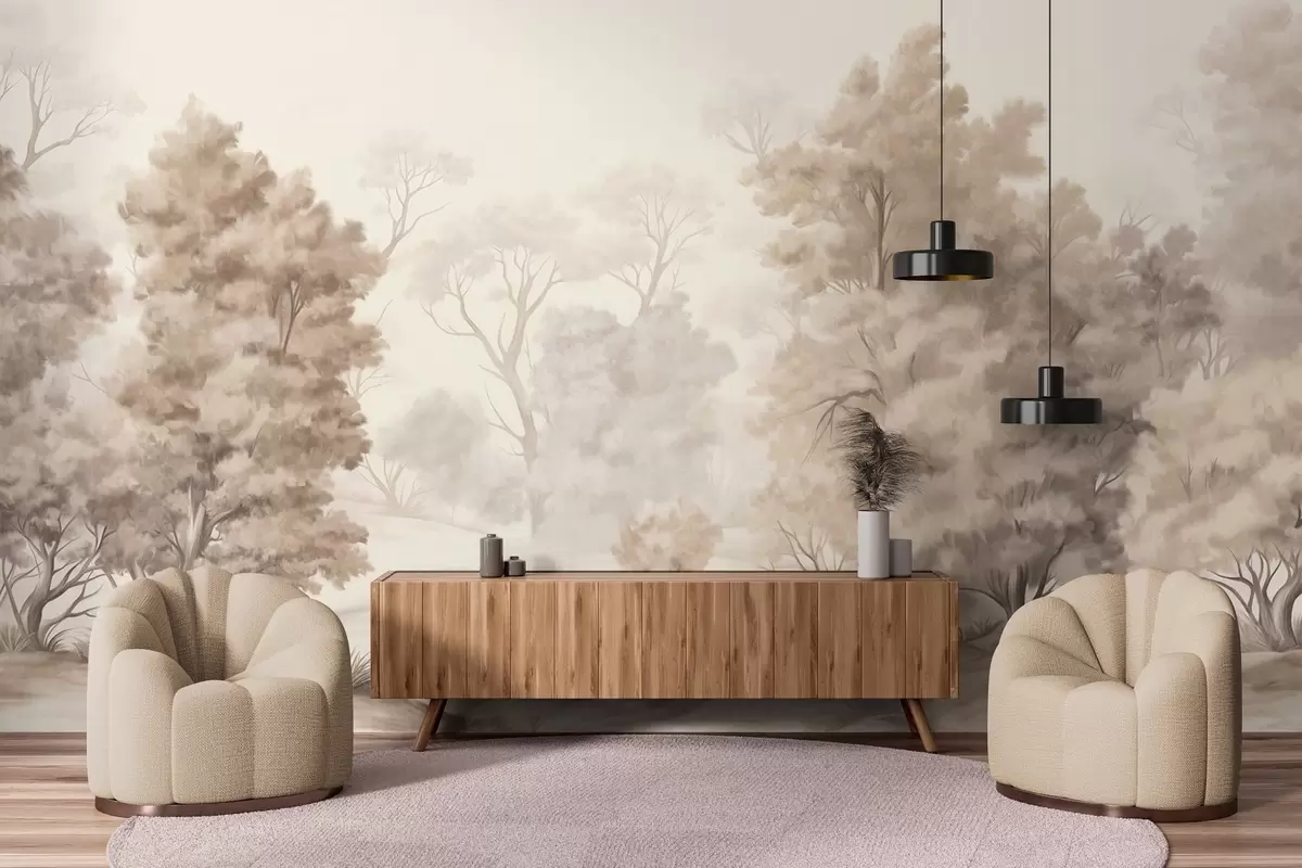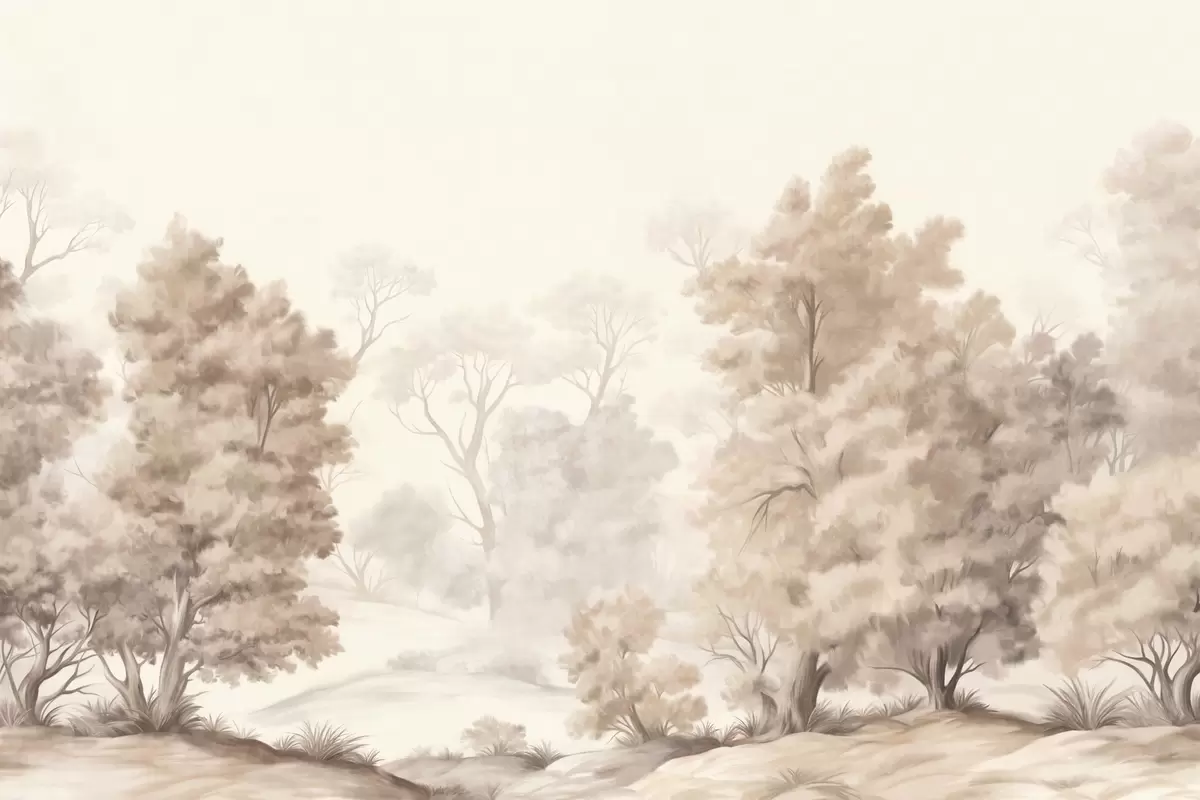 Тапете за зид Текстурирана пејзажна слика имитација шуме са високим дрвећем и травом, пригушене и меке боје, смирујућа сцена бр. w09474