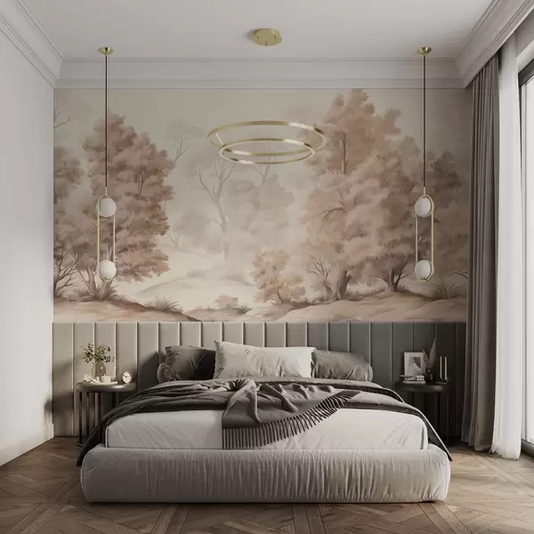 Тапете за зид Текстурирана пејзажна слика имитација шуме са високим дрвећем и травом, пригушене и меке боје, смирујућа сцена бр. w09474