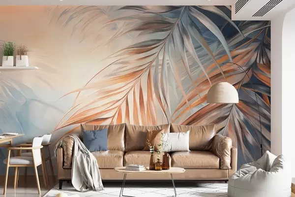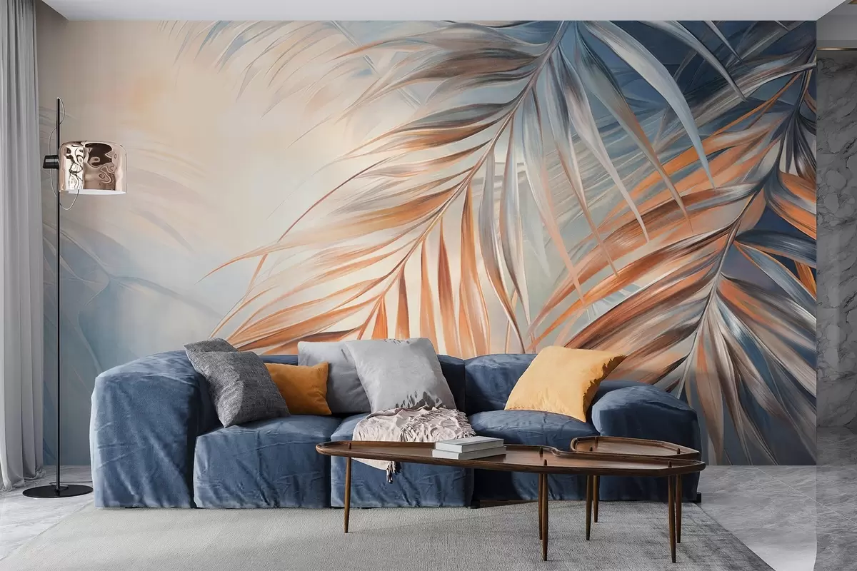 Тапете за зид Палмино лишће са наранџастим и плавим тоновима, светла текстурирана позадина са меким бојама, елегантан тропски стил бр. w09475