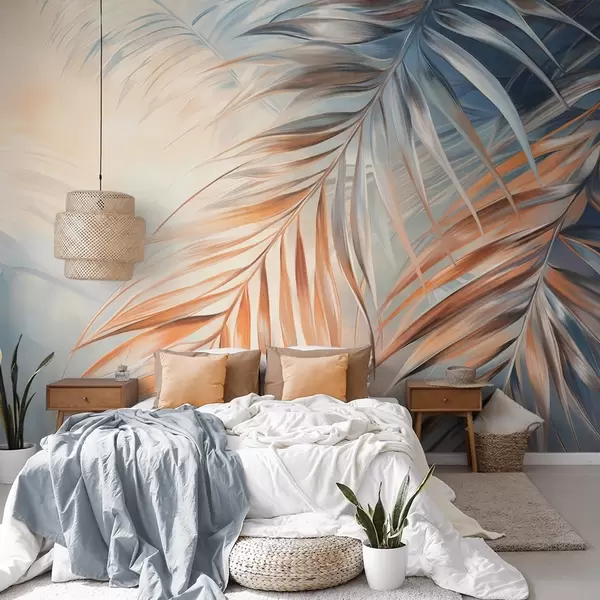 Тапете за зид Палмино лишће са наранџастим и плавим тоновима, светла текстурирана позадина са меким бојама, елегантан тропски стил бр. w09475
