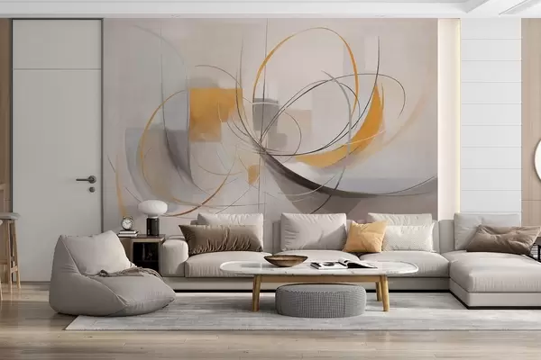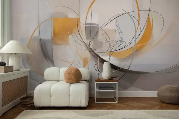 Тапете за зид Апстрактни текстурирани модерни стил сликања са закривљеним линијама и геометријским облицима у нијансама сиве, беле и наранџасте бр. w09476