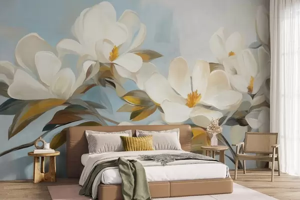 Тапете за зид Беле магнолије са зеленим листовима на светлоплавој позадини са имитацијом апстрактних потеза четкицом бр. w09478