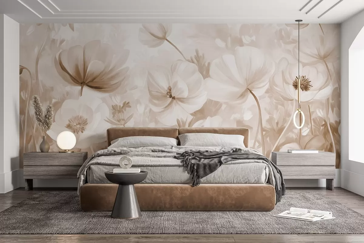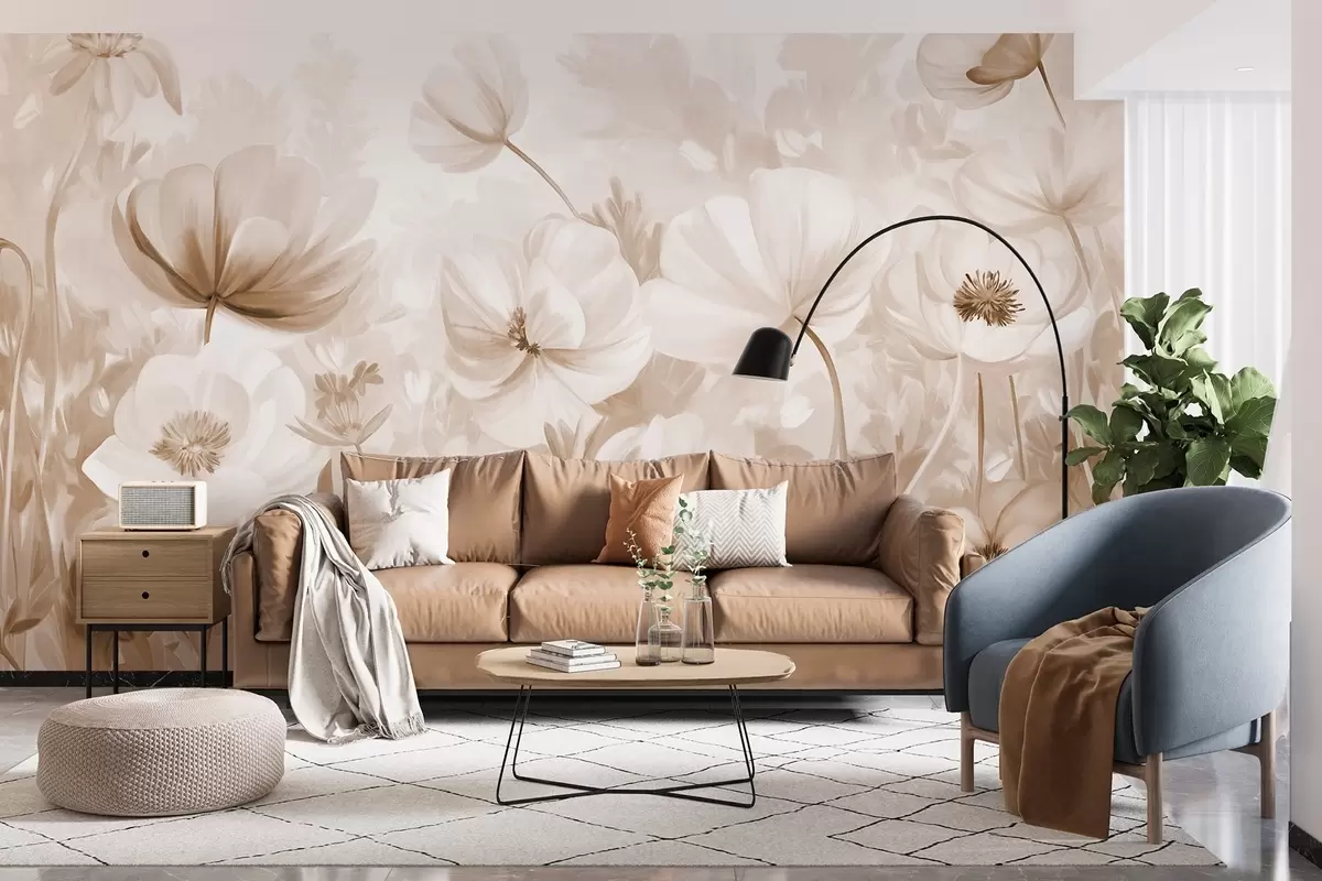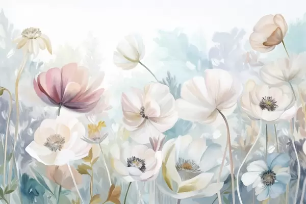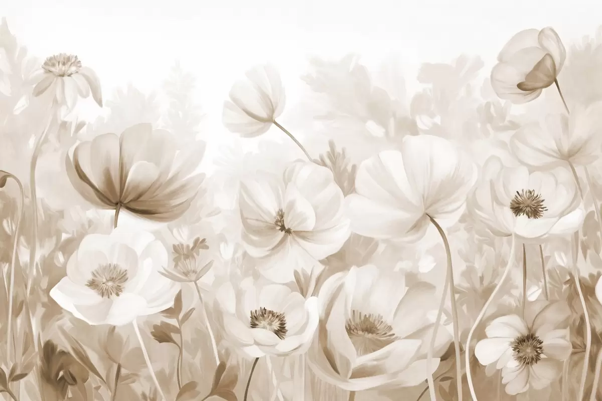 Тапете за зид Поље беж цвећа са нежним латицама, меким смеђим листовима, у сањивом, текстурираном акварел стилу бр. w09481v1