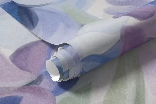 Тапете за зид Љубичасто и плаво текстурирано цвеће са плавим листовима, светла позадина, меки потези четкице, живе боје бр. w09482