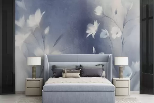 Тапете за зид Бели текстурирани цветови са дугим стабљикама, меки пупољци на замућеној позадини плавих и белих нијанси бр. w09484