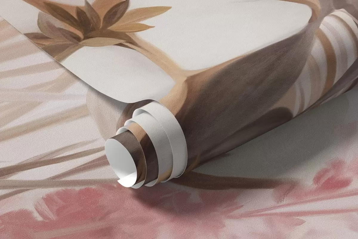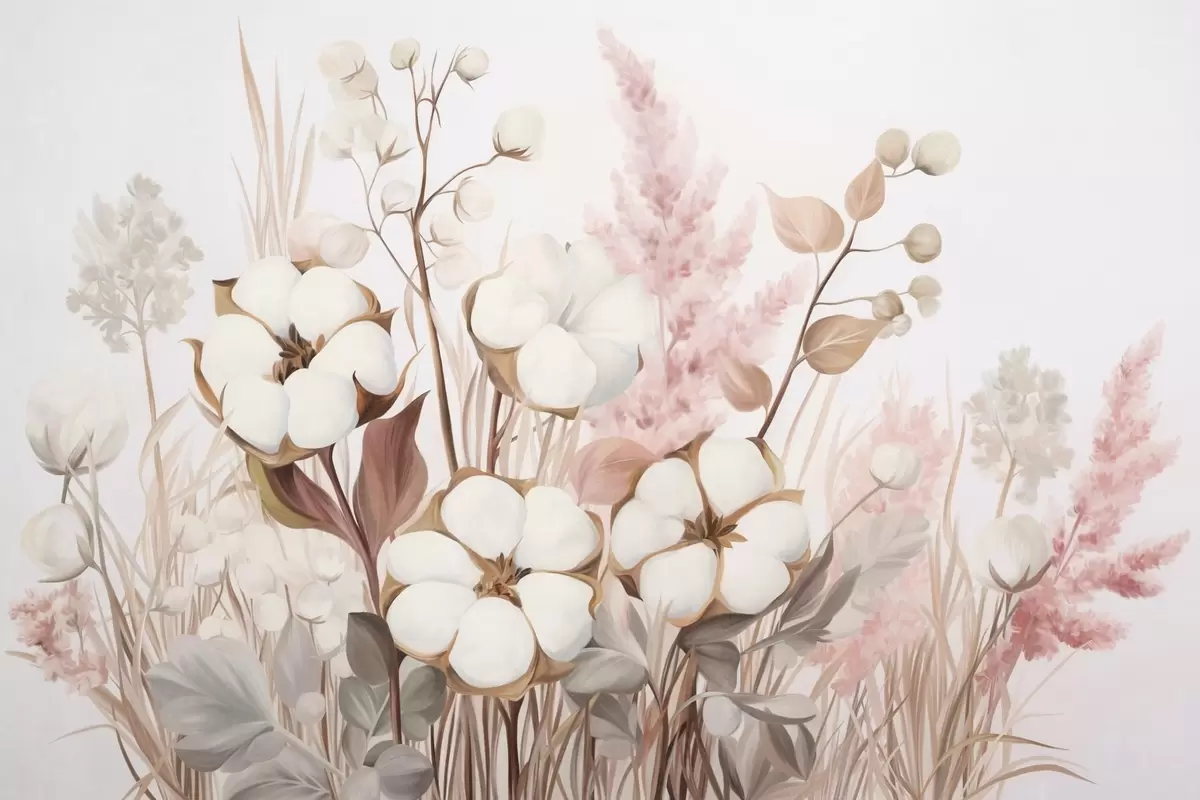 Тапете за зид Памучно текстурирано цвеће са белом и ружичастом пампас травом, беж и смеђим листовима и биљем, белом позадином бр. w09489
