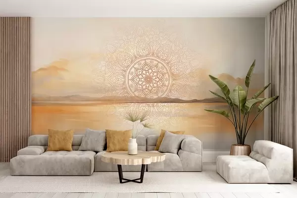 Тапете за зид Текстурирани симетрични дизајн мандале који прекрива пејзаж са морем, брдима и небом, меке пастелне боје бр. w09491