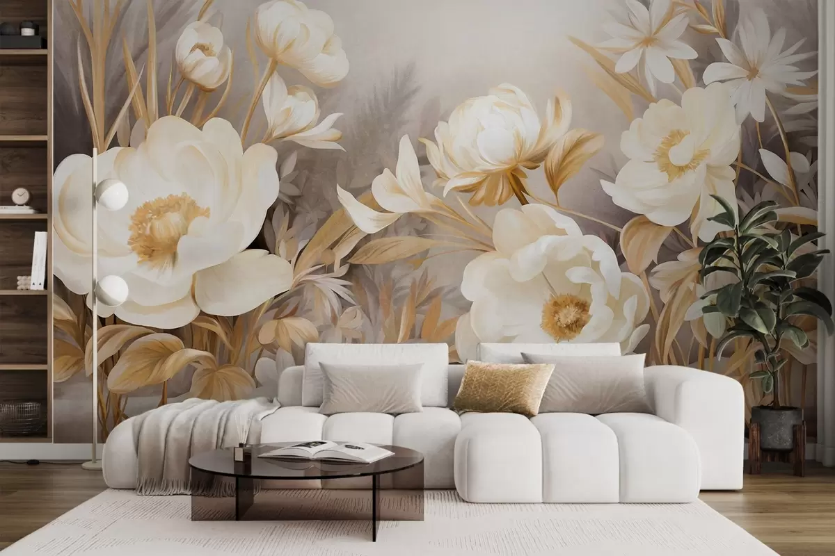 wall murals Бели и жути божури и друго цвеће са високом травом и лишћем у меком, сликарски текстурираном стилу w09494