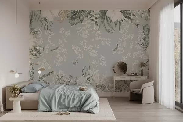 Тапете за зид Тропска текстурирана пастелна уметност са птицама, лептирима, цветовима хибискуса, палминим листовима и дрвећем на светлоплавој позадини бр. w09528