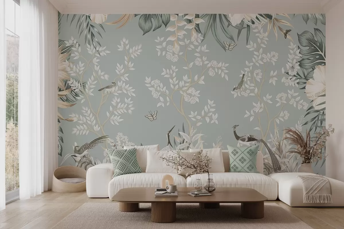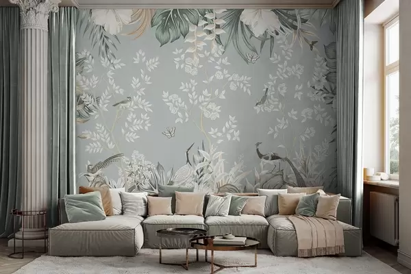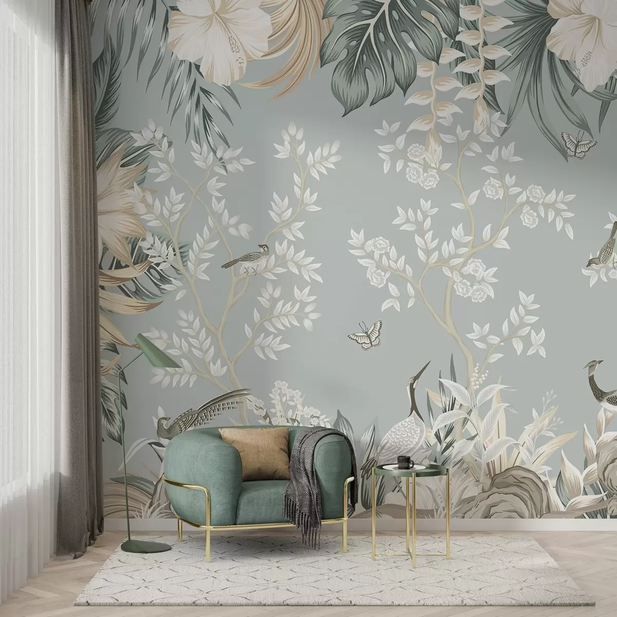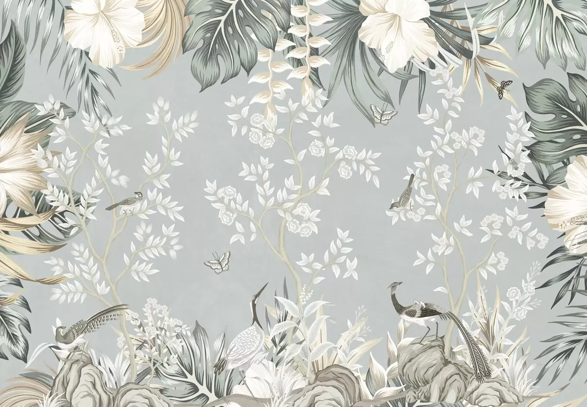 Тапете за зид Тропска текстурирана пастелна уметност са птицама, лептирима, цветовима хибискуса, палминим листовима и дрвећем на светлоплавој позадини бр. w09528
