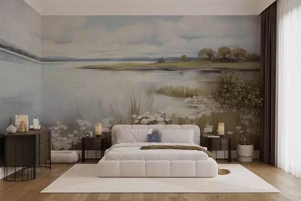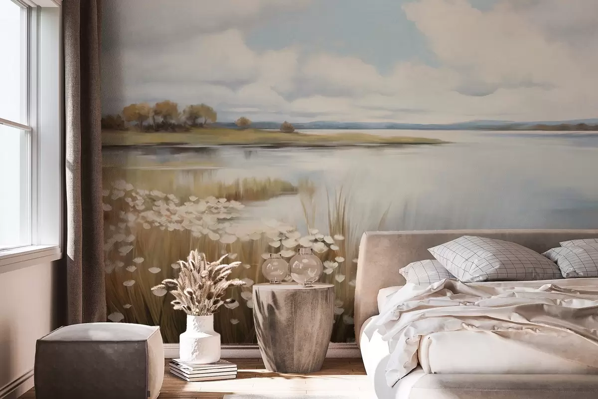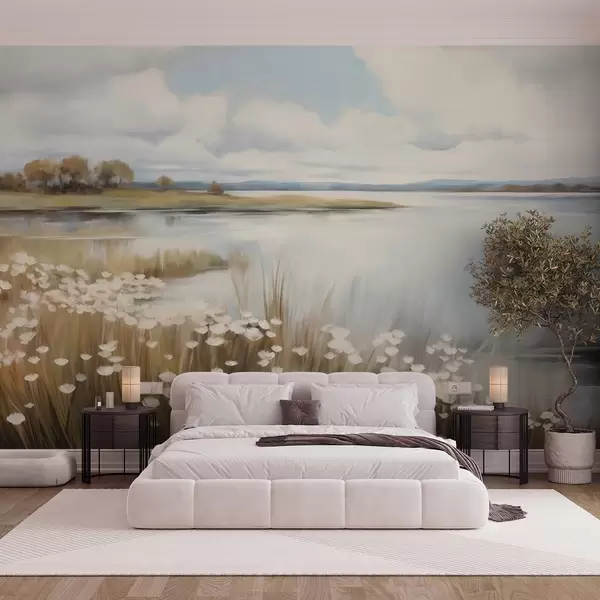 Тапете за зид Текстурирани пејзаж, поље белог цвећа и високе траве, језеро у позадини, травнато брдо са дрвећем, нежне боје бр. w09530