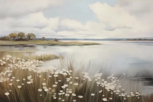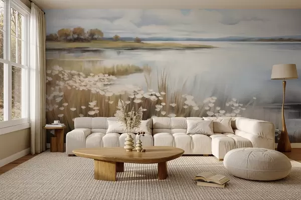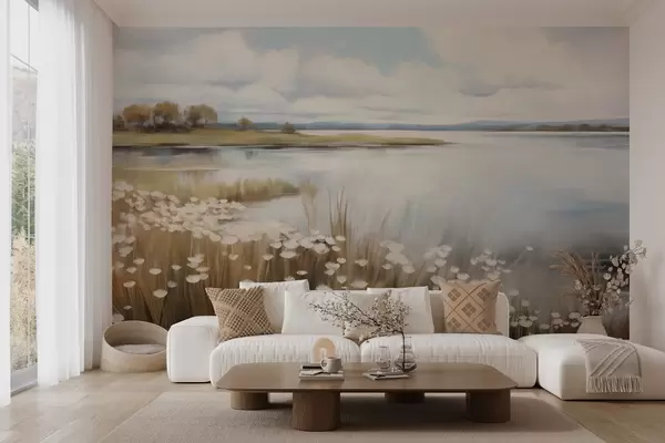 Тапете за зид Текстурирани пејзаж, поље белог цвећа и високе траве, језеро у позадини, травнато брдо са дрвећем, нежне боје бр. w09530