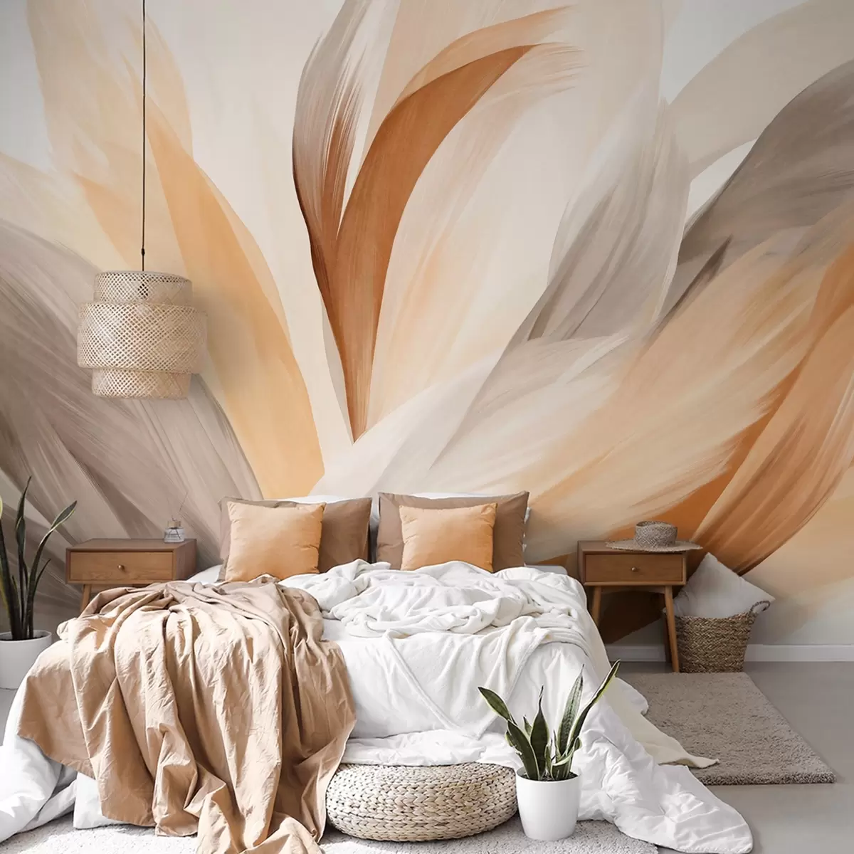 Тапете за зид Апстрактно текстурирано перје у смеђој, белој и сивој боји и разним нијансама, које се преклапају на белој позадини бр. w09531