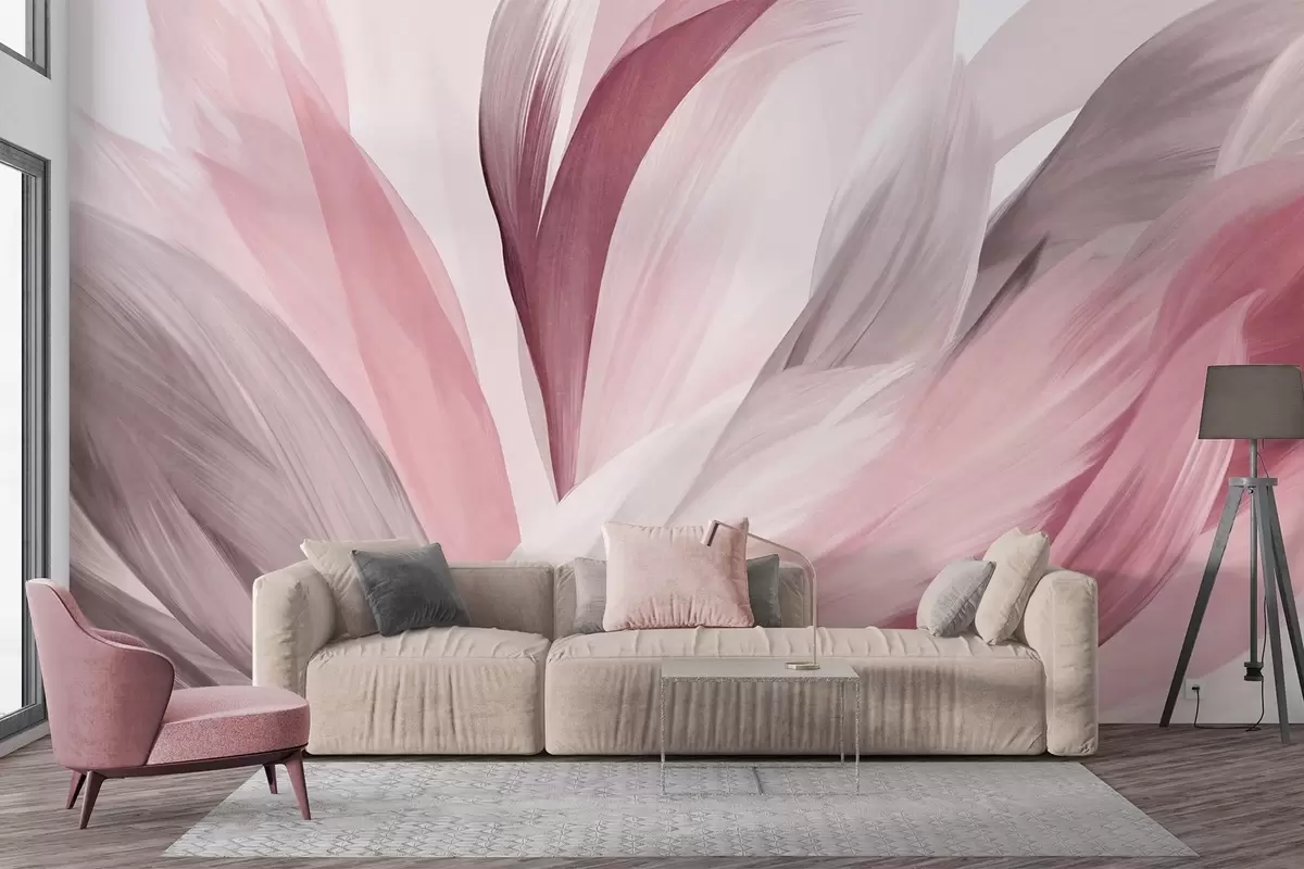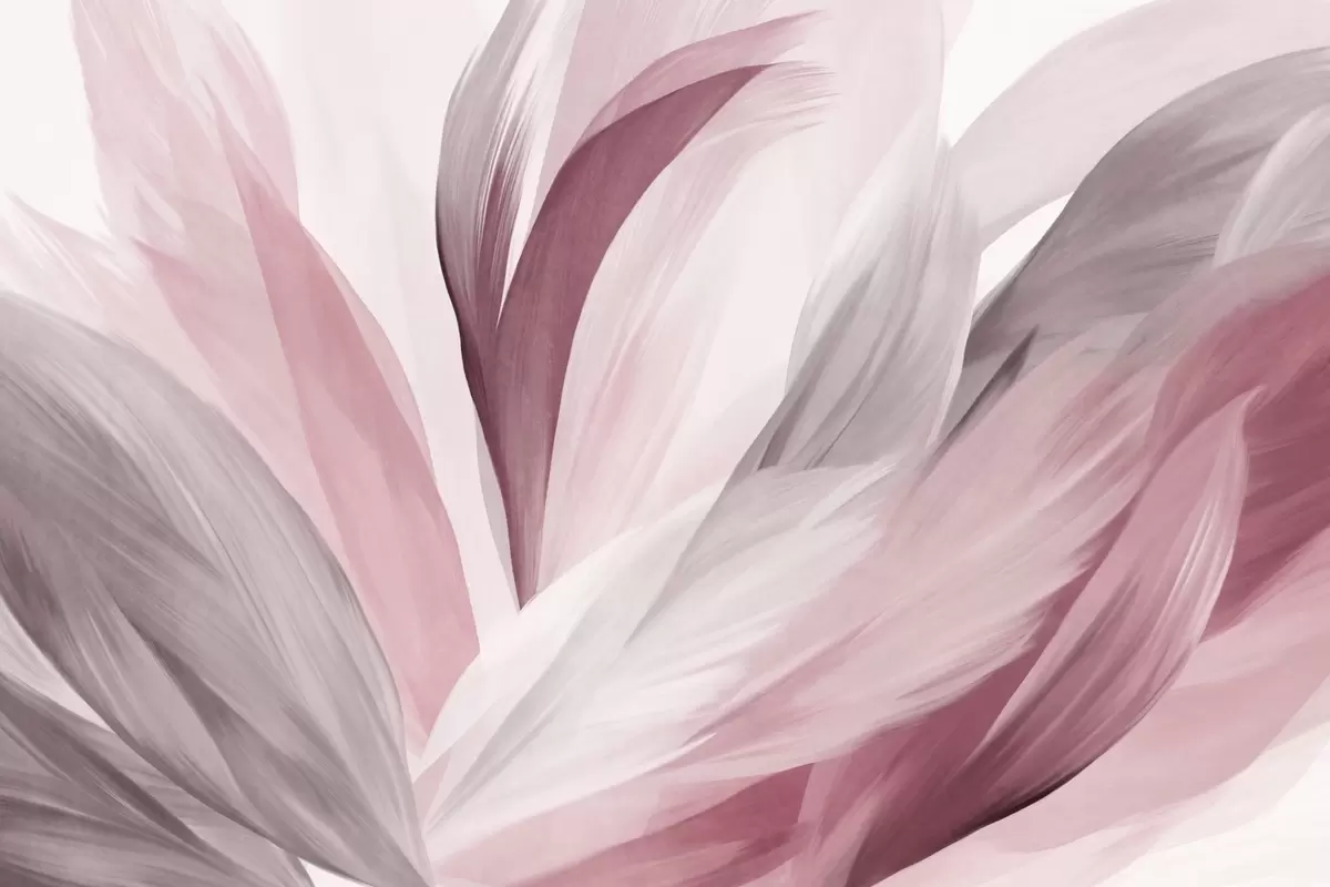 Тапете за зид Апстрактно текстурирано перје у ружичастој, белој и сивој боји и разним нијансама, које се преклапају на белој позадини бр. w09531v2