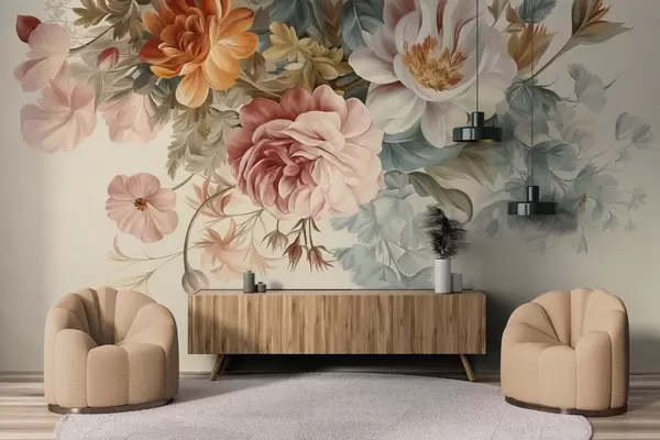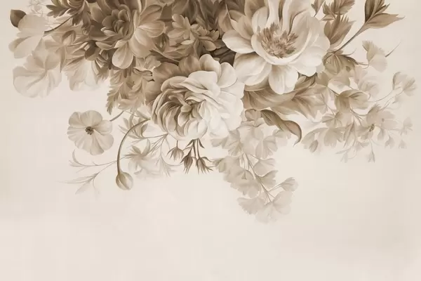 Тапете за зид Винтаж цветни аранжман са ружама, божурима и другим текстурираним цвећем са лишћем, на светлој позадини бр. w09532