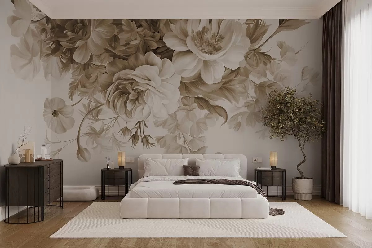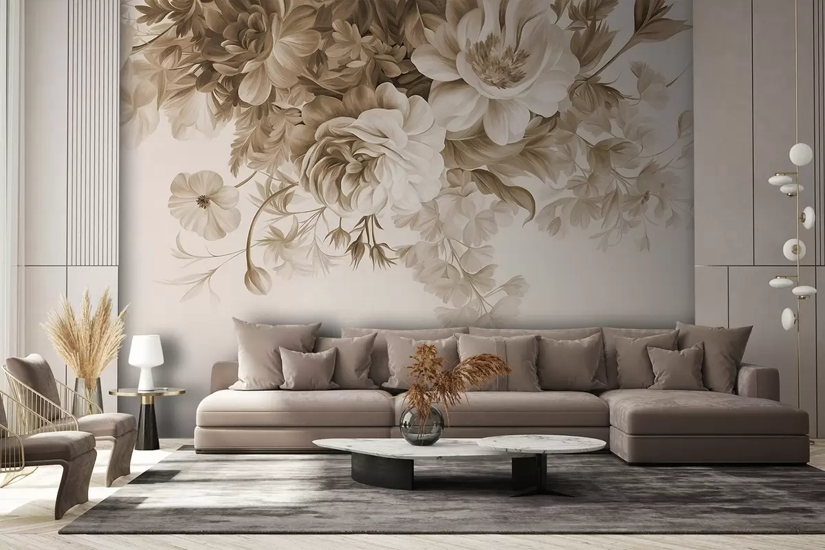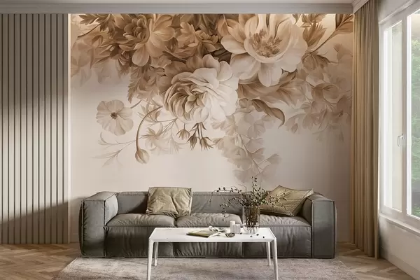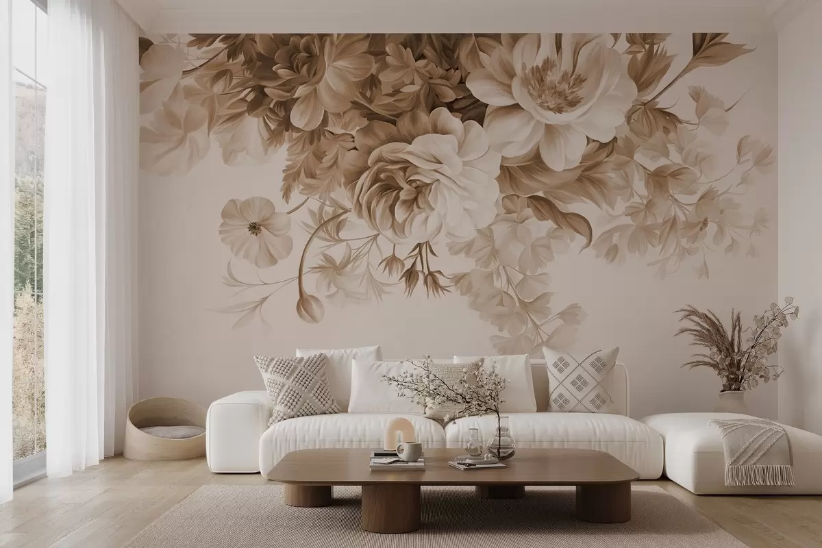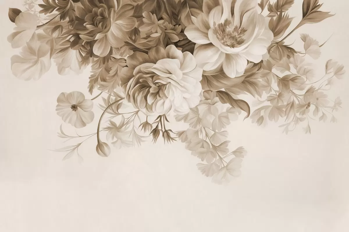 Тапете за зид Винтаж цветни аранжман са ружама, божурима и другим текстурираним цвећем са лишћем, на светлој позадини бр. w09532v1