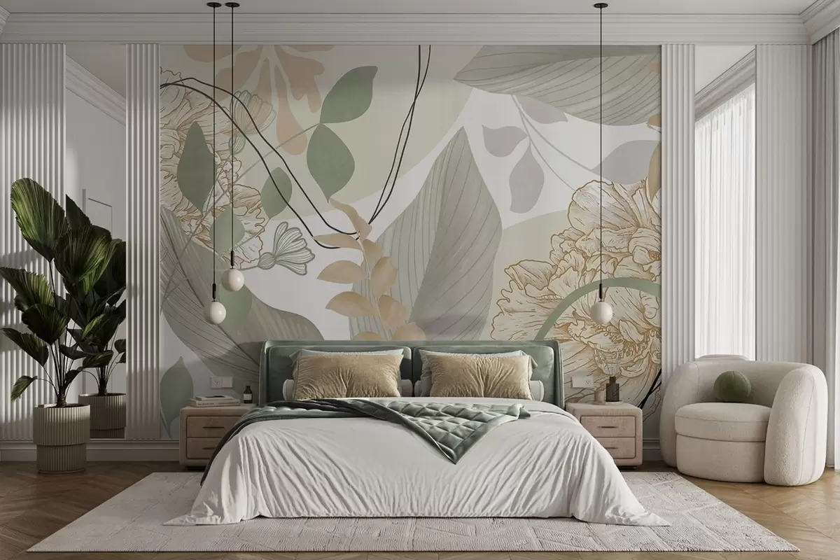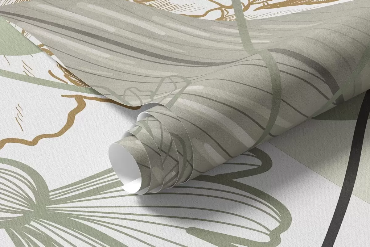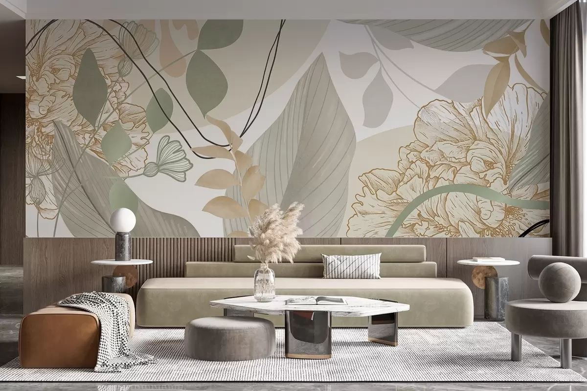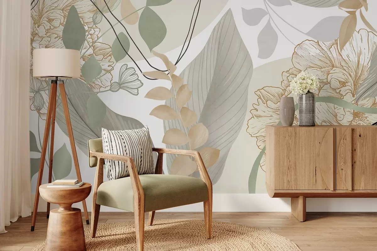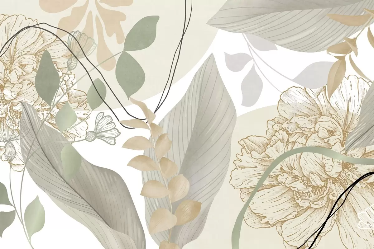 Тапете за зид Апстрактни цветни принт са великим листовима у нијансама пригушене зелене и жуте боје са танким црним линијама и белим цветним обрисима бр. w09544v2