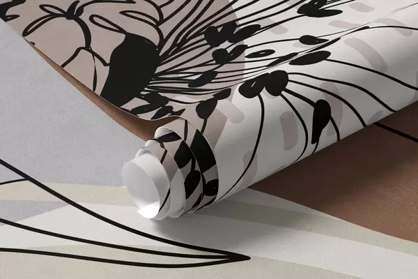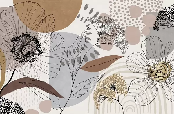 Тапете за зид Апстрактни цветни текстурирани отисак са линијском уметношћу цвећа, лишћа и органских облика у пригушеним смеђим, беж и сивим тоновима бр. w09548